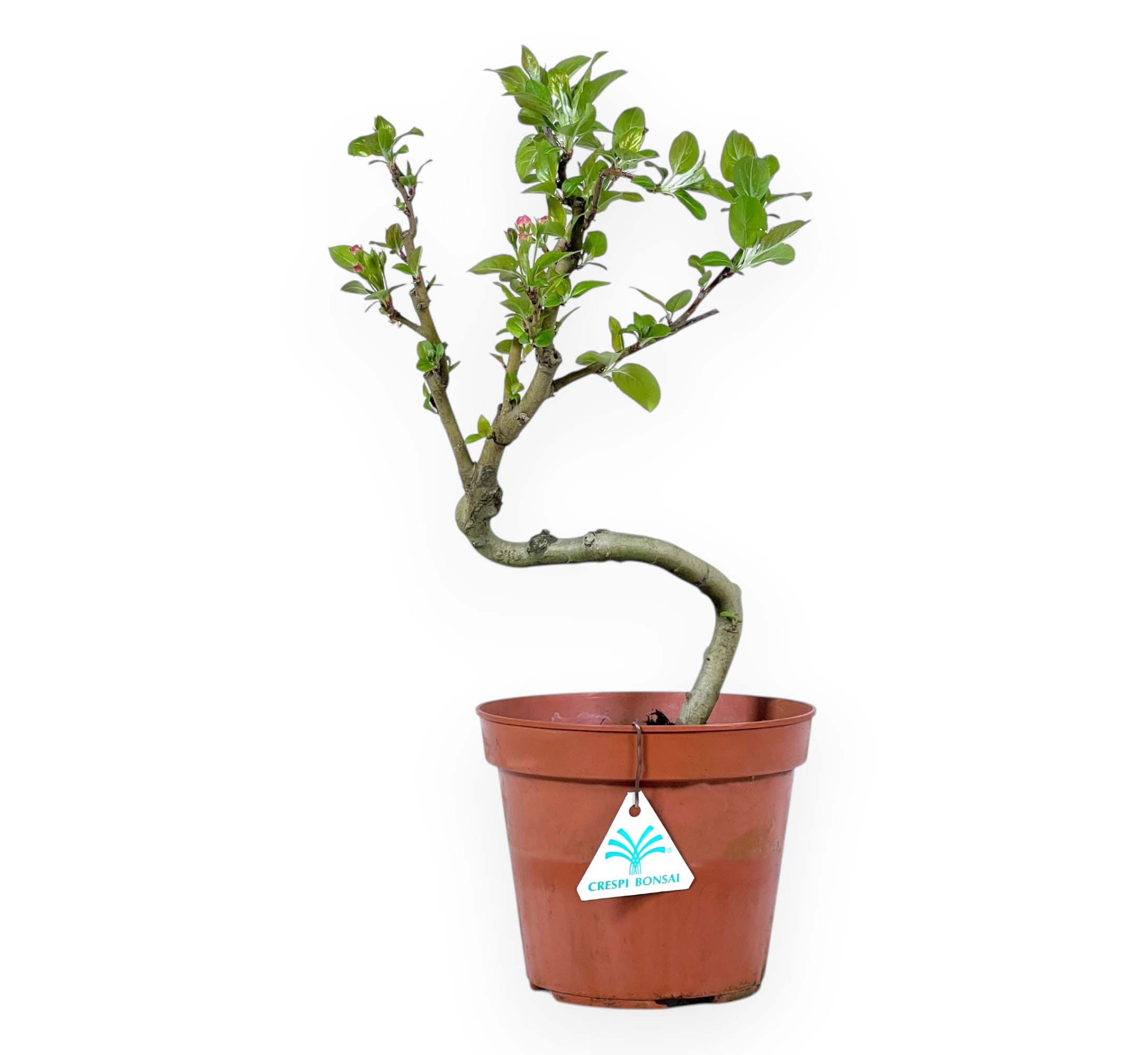 La planta de trabajo de Malus Evereste (manzano), perteneciente a la variedad de árboles frutales caducifolios, es apreciado por su floración primaveral de color blanco rosado y la posterior producción de pequeños frutos, que pasan de verde amarillento a rojo cuando maduran, lo que le da carácter al árbol. El follaje se tiñe de amarillo anaranjado en otoño y se despoja en invierno. Se trata de una planta de crecimiento y porte, con una estructura ligera y un movimiento sinuoso, cultivada en un maceta redondo de plástico marrón.