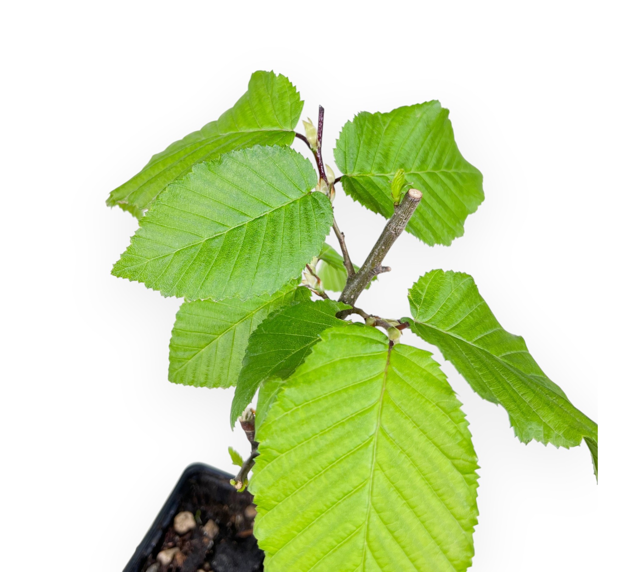 Planta para trabajar de Carpinus betulus frans fontaine (carpe), variedad caducifolia, es apreciada por su corteza pálida y sus hojas dentadas de color verde brillante. El follaje se vuelve amarillo dorado a naranja parduzco en otoño y se despoja de sus hojas en invierno, lo que le confiere un aspecto muy decorativo. En primavera pueden aparecer las flores, en forma de inflorescencias colgantes llamadas amentos: los masculinos son más largos y llamativos, mientras que los femeninos son más pequeños y discretos. Tras la floración, se desarrollan pequeños frutos alados agrupados en racimos, decorativos pero no especialmente llamativos. Es una planta de crecimiento y conformación. Cultivada en un maceta cuadrado de plástico negro.