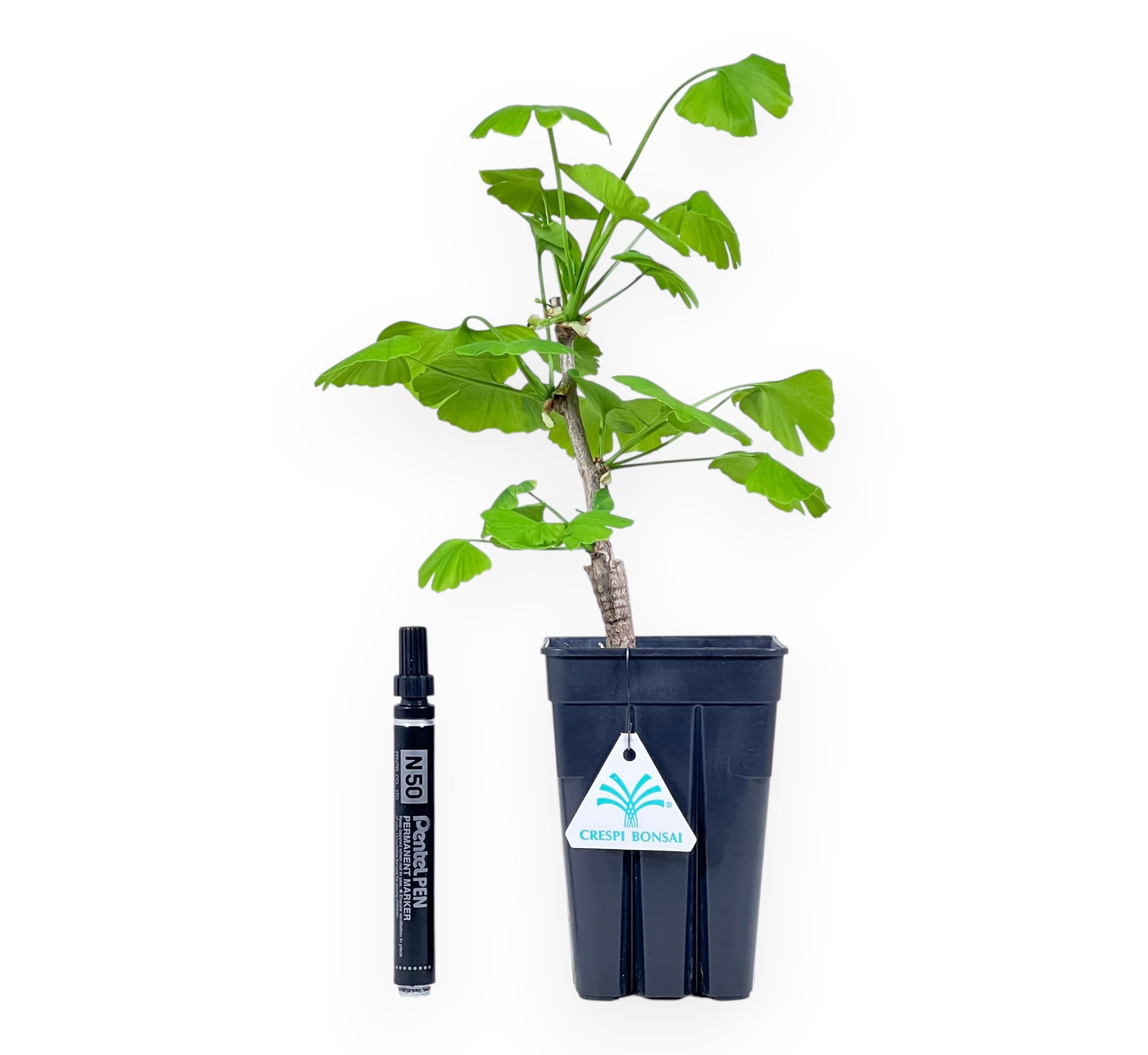 Planta para trabajar de Ginkgo biloba es una antigua especie caducifolia, conocida por sus hojas en forma de abanico y su intenso color amarillo otoñal. El follaje, inicialmente verde, se vuelve amarillo anaranjado en otoño y pierde sus hojas en invierno. Tiene un tronco con una corteza fascinantemente fisurada. Es una planta de crecimiento y conformación. Cultivada en un maceta cuadrado de plástico negro.