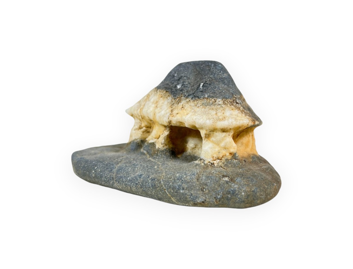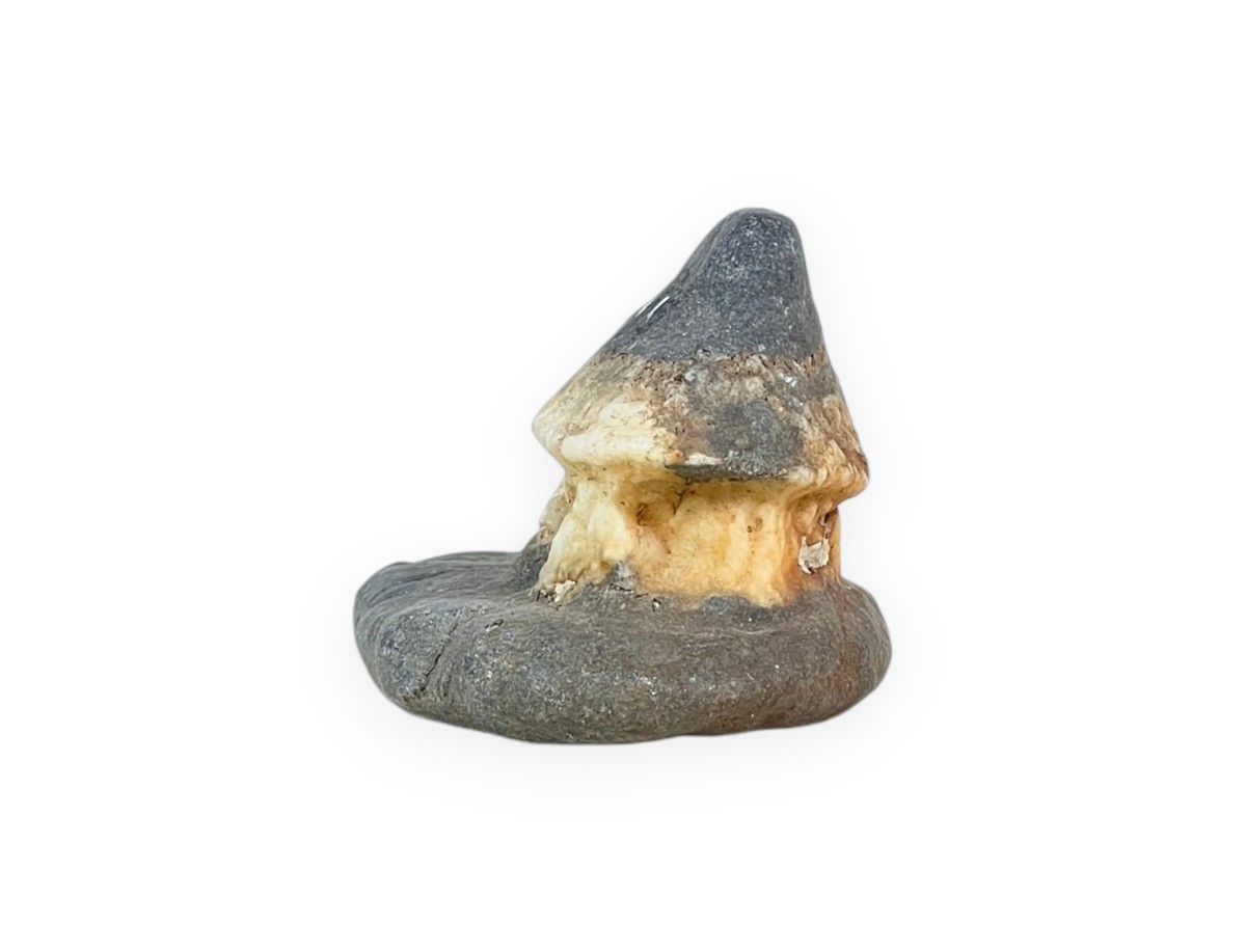 Este suiseki japonés tiene una forma natural que recuerda una pequeña cabaña: la parte superior cónica de color gris oscuro evoca un tejado inclinado, mientras que la banda central más clara, en tonos crema y beige, sugiere las paredes de la cabaña. Un hueco en la parte delantera recuerda una entrada o una ventana, acentuando aún más el parecido con una vivienda rural.