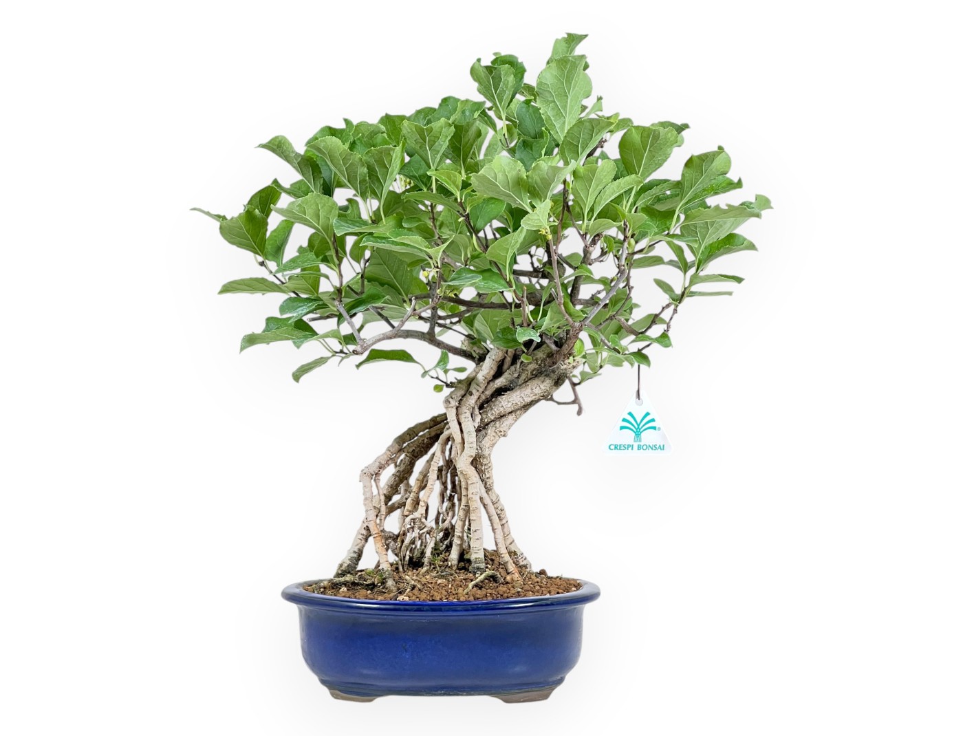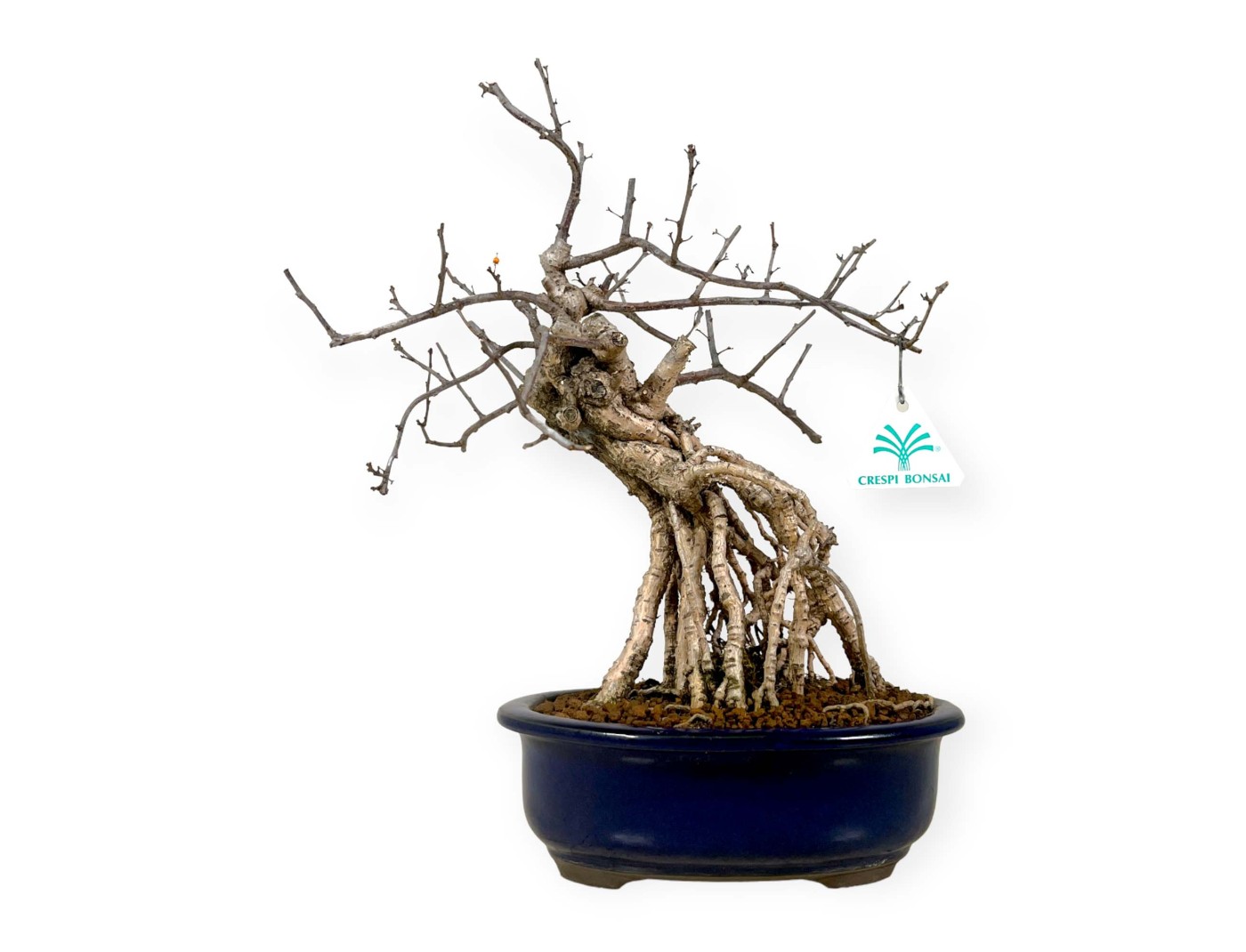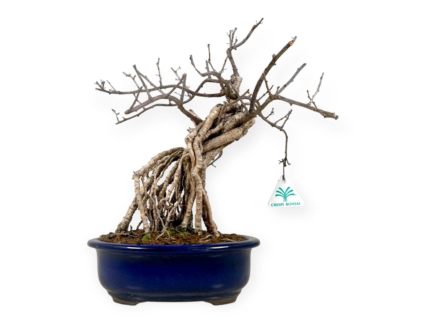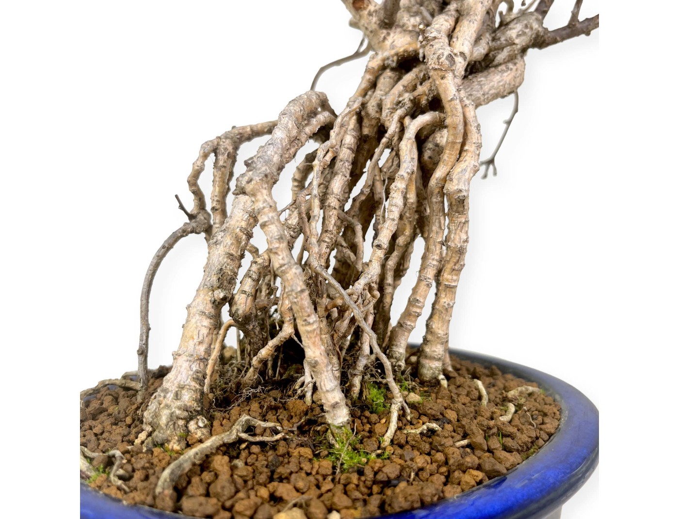 Bonsaï à feuilles caduques, dans un pot ovale en grès émaillé bleu