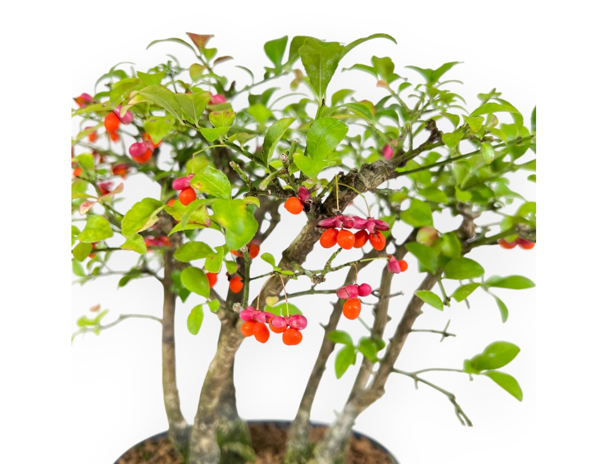 Ce bonsaï d'Euonymus (évonnome) est une espèce fruitière ornementale à feuilles caduques. Il est apprécié pour sa floraison printanière, ses petites fleurs blanc-vert à 4 pétales, et sa fructification ultérieure avec des fruits en forme de capsules rougeâtres qui s'ouvrent en mûrissant, laissant apparaître des graines rouge-orange. En automne, le feuillage prend de magnifiques teintes rouge-orange et se dénude en hiver, laissant souvent les fruits visibles sur les branches. Le pot ovale en grès émaillé bleu met en valeur la structure harmonieuse de l'arbre. Cultivé dans le style forestier (Yose-ue), il apporte mouvement et naturel.
