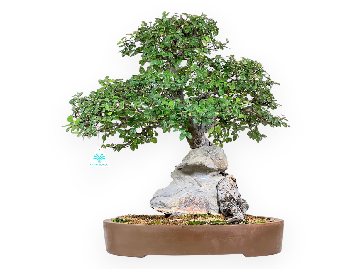 Ce bonsaï d'Ulmus Parviflora (orme) est une espèce à feuilles caduques très appréciée dans le bonsaïsme pour sa rusticité, sa croissance harmonieuse et sa ramification dense. Le feuillage compact et équilibré composé de petites feuilles dentées donne au bonsaï un caractère mature et riche. Le feuillage devient jaune orangé en automne et perd ses feuilles en hiver. Ce spécimen est coiffé d'un style rocher (Seki-joju), où les racines s'accrochent et s'entrelacent à une grande pierre centrale, créant un effet naturel et hautement symbolique. Le tronc robuste s'enroule autour du rocher avec un mouvement élégant et dynamique. Le bonsaï est cultivé dans un pot ovale en grès non émaillé, idéal pour apporter une touche d'élégance et mettre en valeur l'harmonie entre la plante et la roche.