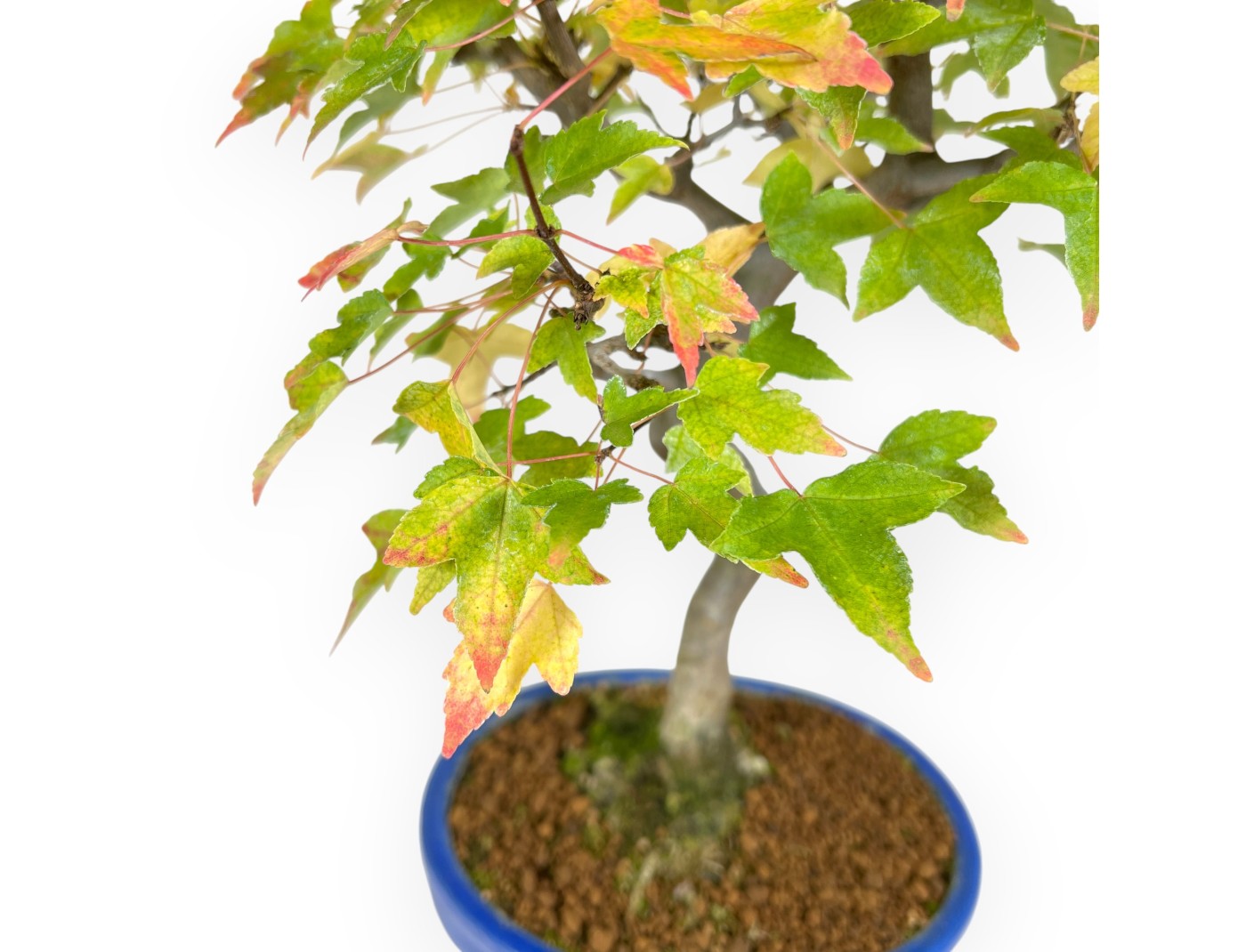 Ce bonsaï de Acer buergerianum (érable) est une espèce à feuilles caduques, appréciée pour son feuillage caractéristique qui change de couleur au fil des saisons. Au printemps et en été, ses feuilles sont d'un vert vif, tandis qu'en automne, elles prennent des teintes de rouge et d'orange, jusqu'à ce que le bonsaï perde ses feuilles en hiver. Le pot ovale en grès émaillé bleu, il contraste élégamment avec les teintes du feuillage, ce qui rehausse sa beauté.