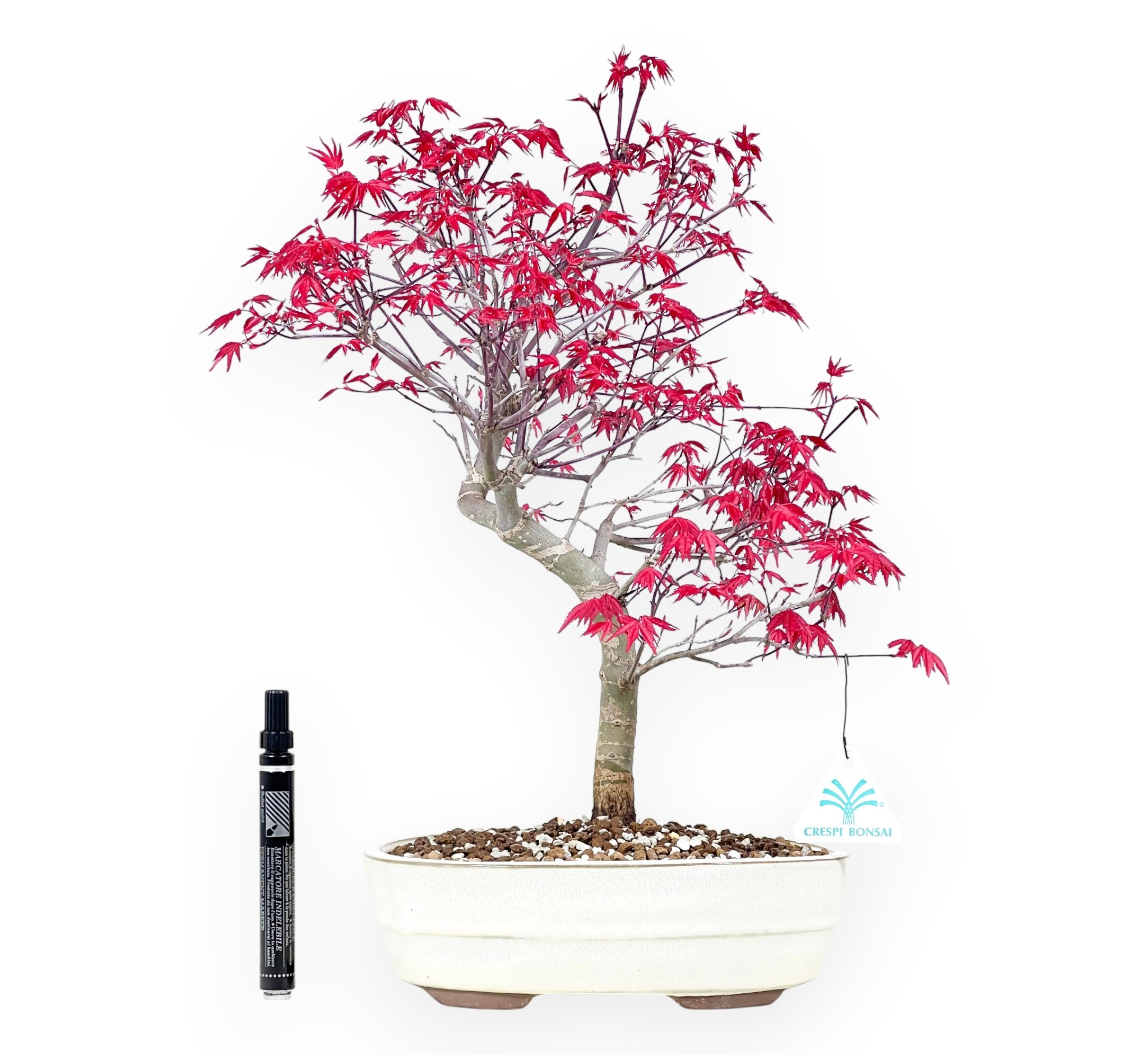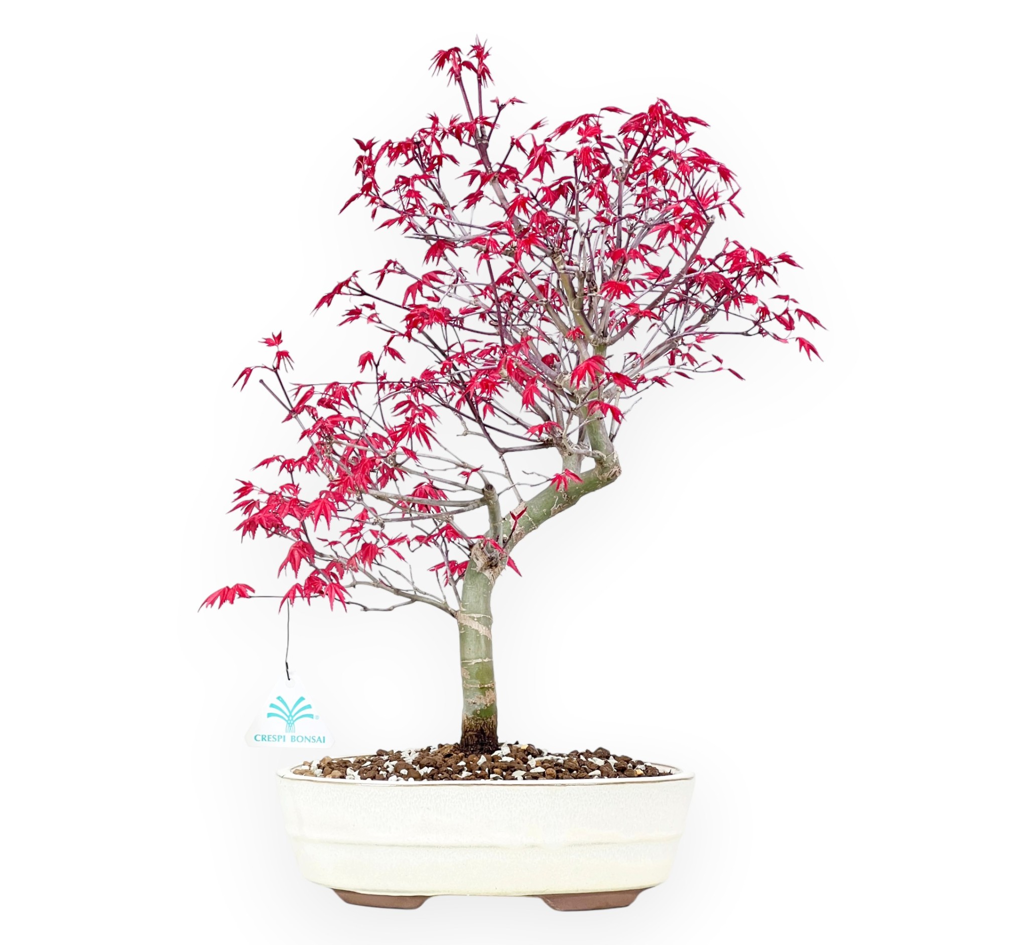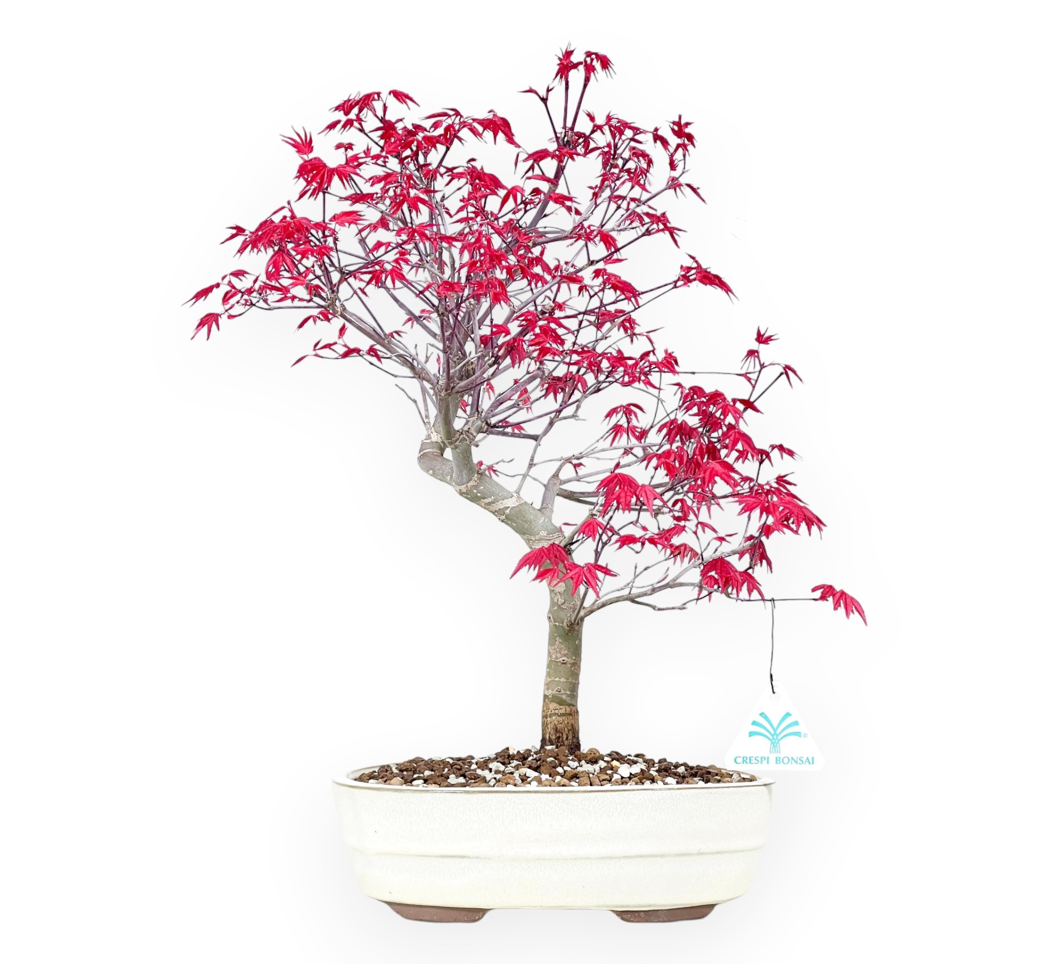 Le bonsaï de Acer palmatum (érable) est une espèce à feuilles caduques, appréciée pour son feuillage exquis qui change de couleur au fil des saisons, passant du vert profond au jaune orangé, au rouge profond en automne, jusqu'à ce que le bonsaï perde ses feuilles en hiver. Cultivé dans un pot ovale en grès émaillé crème complète le bonsaï en rehaussant la beauté de la plante, en lui apportant équilibre et raffinement.