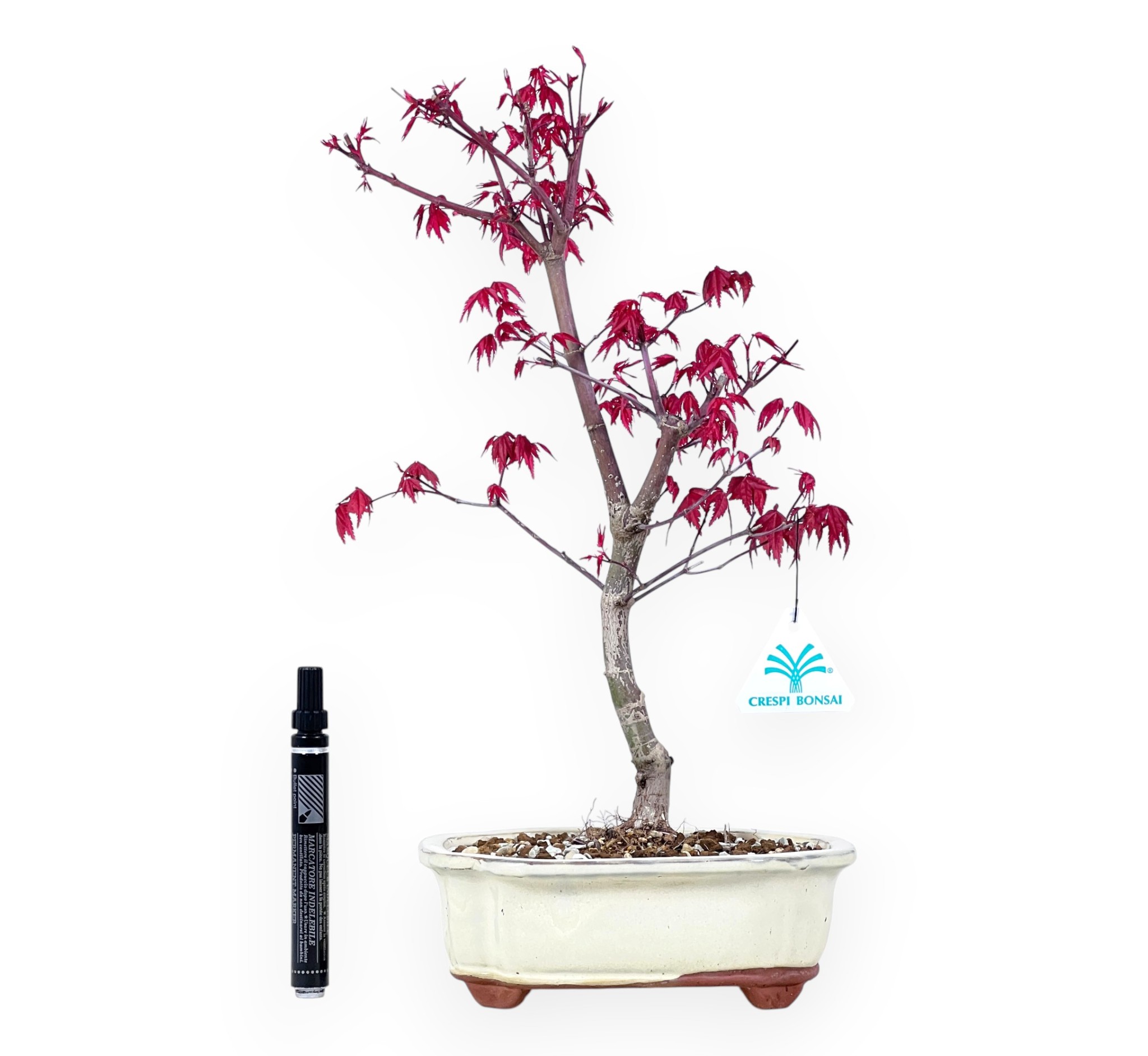 Bonsaï de Acer palmatum deshojo (érable) est une espèce à feuilles caduques, connue pour ses feuilles palmées aux teintes saisonnières vibrantes. Le feuillage, d'un rouge vif, prend des teintes allant du rouge intense au rouge-orange en automne et perd ses feuilles en hiver. Cultivé dans un pot à nuage en grès émaillé crème complète le bonsaï en rehaussant la beauté de la plante, en lui apportant équilibre et raffinement.