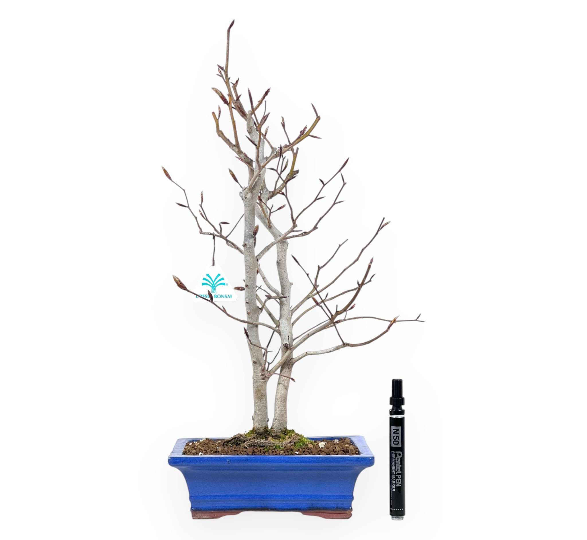 Bonsaï de Hêtre caractérisé par une hauteur hors pot de 43,5 cm, un tronc de 2 cm et un nebari de 9 cm. La plante est cultivée dans un pot rectangulaire en grès émaillé dont les dimensions sont de 20x16xH6,5 cm.