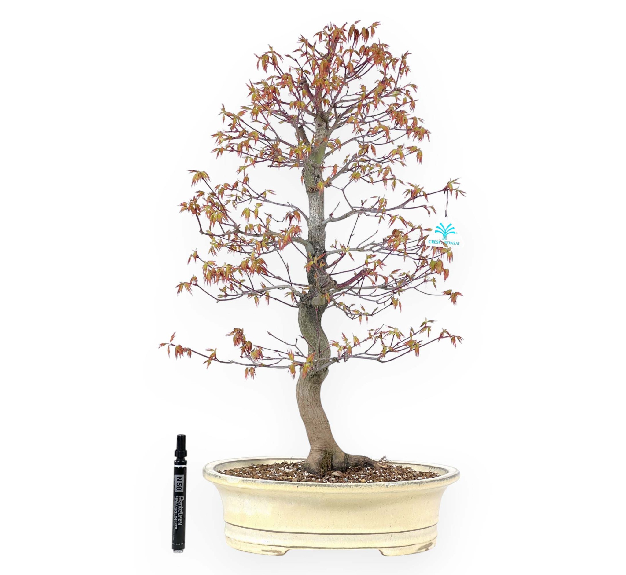 Bonsaï de Acer palmatum Yamamomiji (érable), une espèce à feuilles caduques, appréciée pour l'extraordinaire variabilité de ses couleurs et la délicatesse de son feuillage. Le feuillage rouge-orange vif est coloré d'un vert délicat, conservant parfois de légères nuances rougeâtres sur les bords ou les jeunes pousses. En automne, le feuillage s'illumine de couleurs intenses allant du rouge vif à l'orange et au jaune d'or, et perd ses feuilles en hiver. Son tronc a un mouvement sinueux. Dans un style informel et érigé (moyogi), il se caractérise par un tronc élancé et légèrement sinueux qui donne du naturel et du mouvement à la composition. La ramification fine et bien répartie crée un feuillage aéré et équilibré, renforçant la légèreté typique des érables. Cultivé dans un pot ovale en grès émaillé crème, il met en valeur les nuances délicates du feuillage.