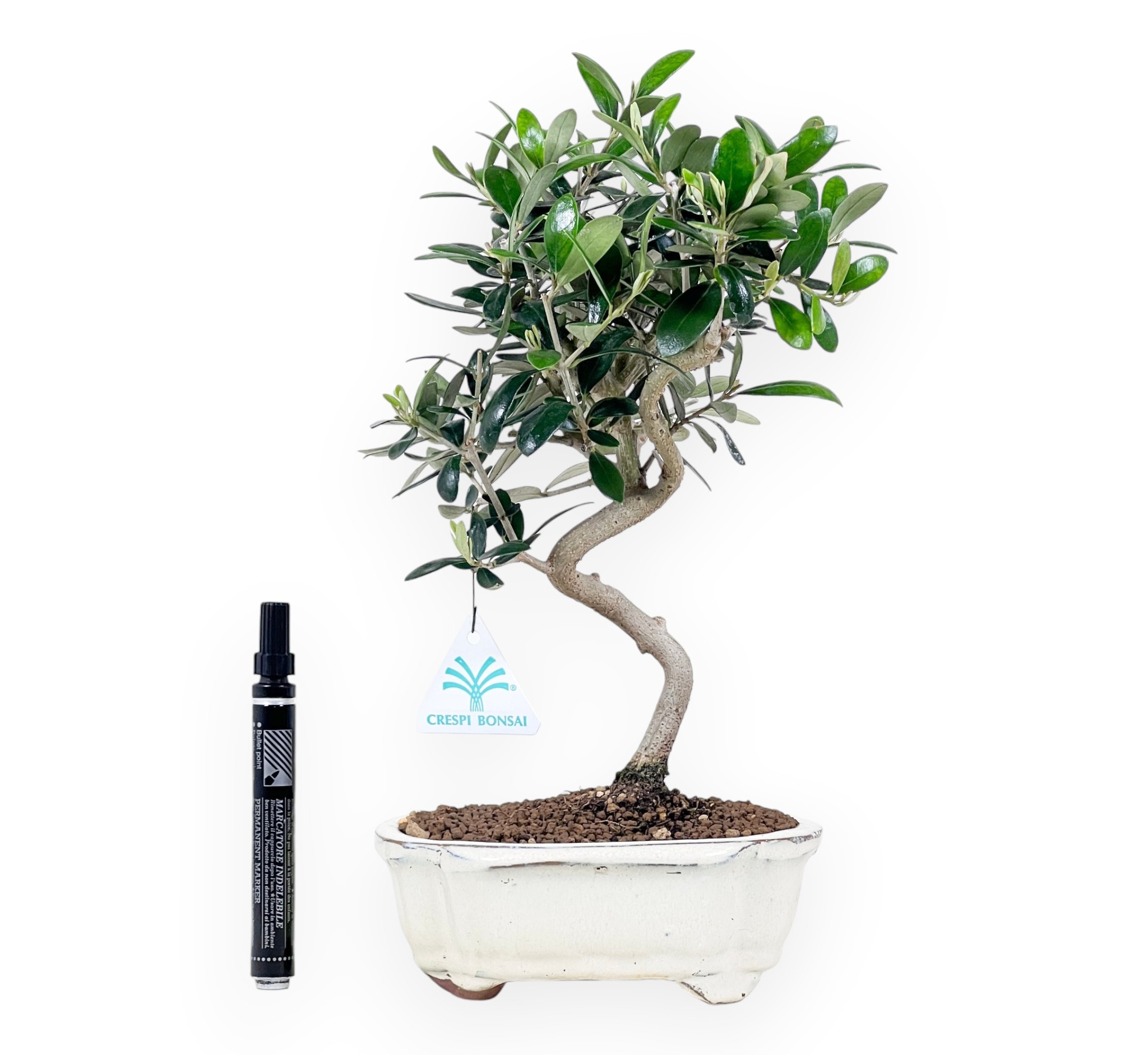 Le bonsaï d'Olea europaea (olivier) est une plante à feuilles persistantes au charme méditerranéen, appréciée pour son feuillage coriace vert foncé aux reflets argentés et son port élégant et harmonieux. Au printemps, il peut présenter une délicate floraison blanche, parfois suivie de la production de petites olives ornementales. Cet exemplaire se distingue par son tronc élancé au mouvement sinueux en forme de S, qui lui confère dynamisme et légèreté. Le feuillage compact et bien proportionné est soigneusement structuré par des branches équilibrées qui rehaussent la ligne du tronc et créent un ensemble raffiné et naturel. Cultivé dans un pot nuage en grès émaillé de couleur crème, il met en valeur l'élégance de la plante et souligne le contraste entre l'écorce claire et le feuillage brillant.