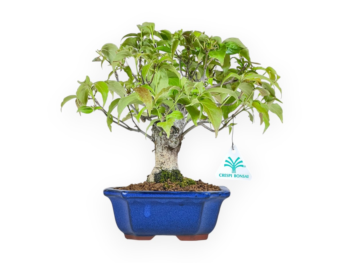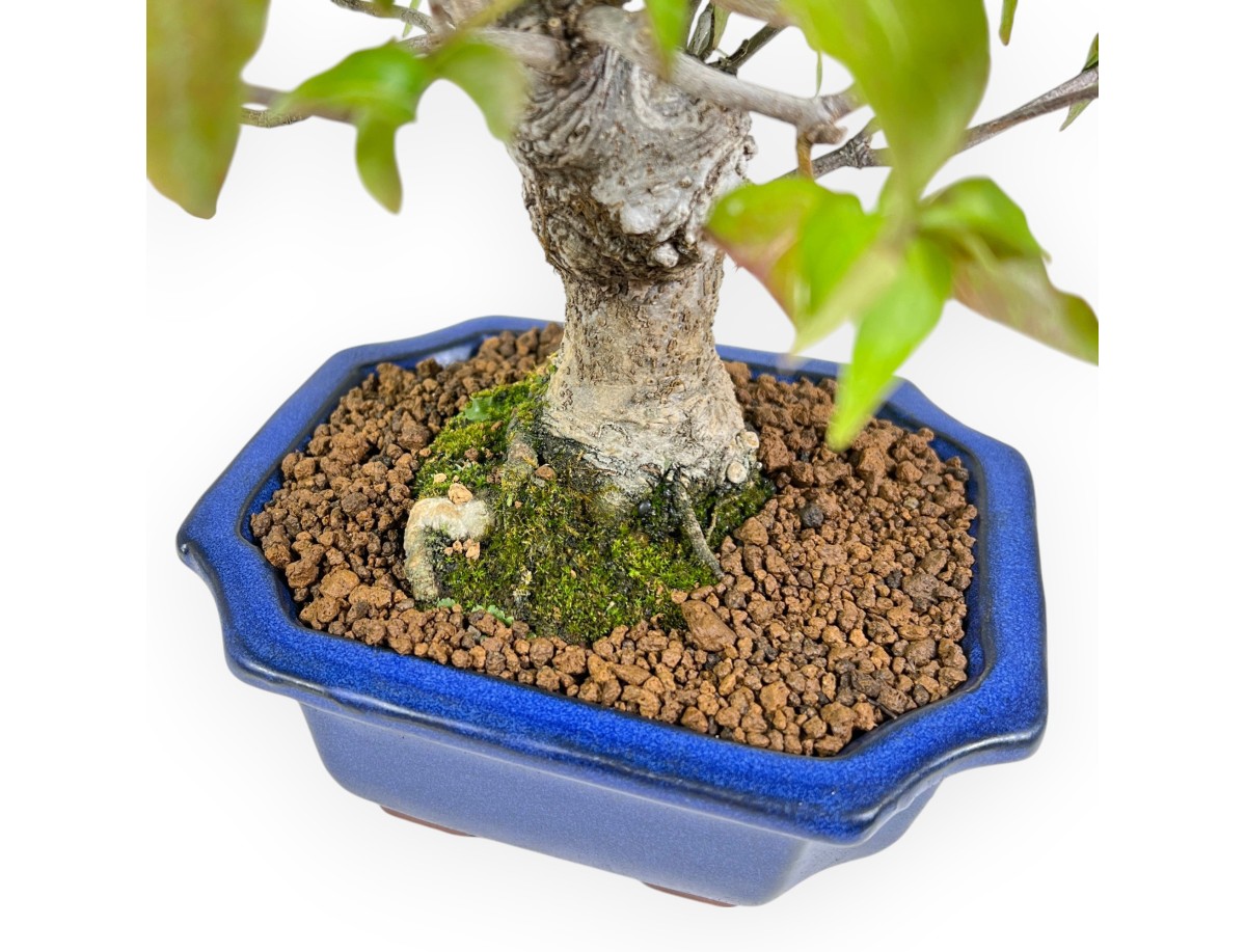 Bonsaï à fleurs caduques, dans un pot en grès émaillé bleu rectangulaire