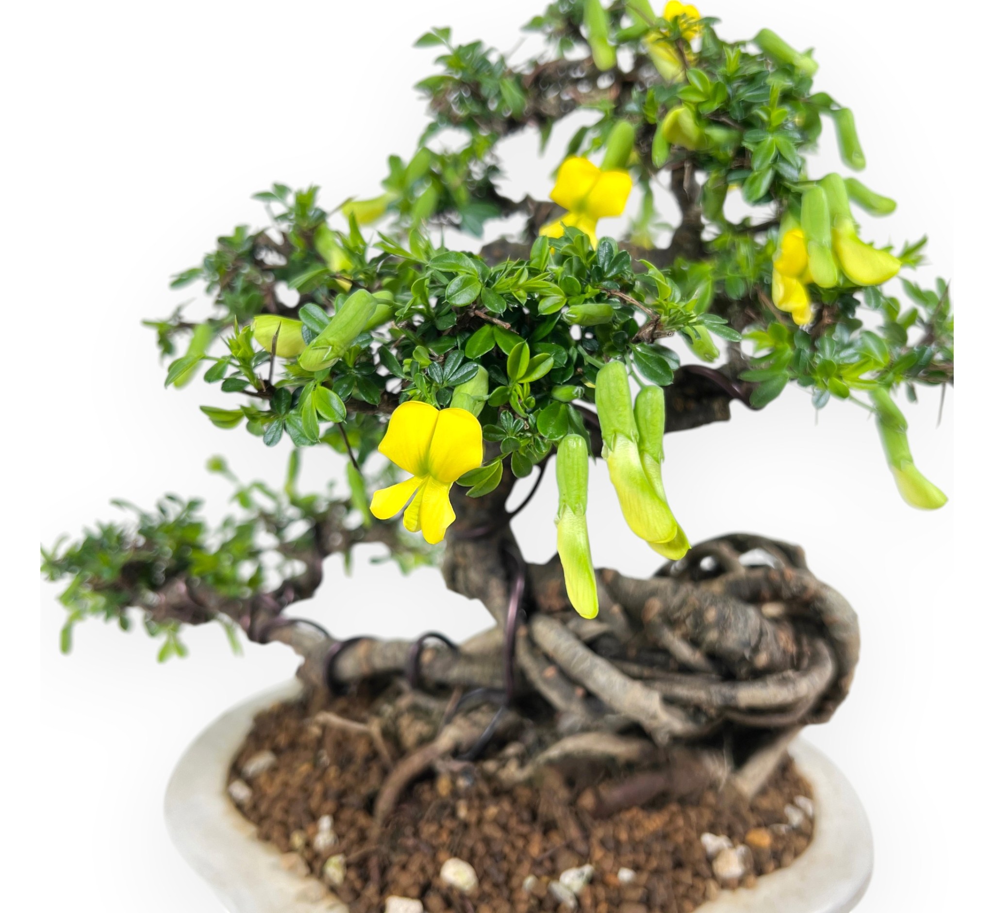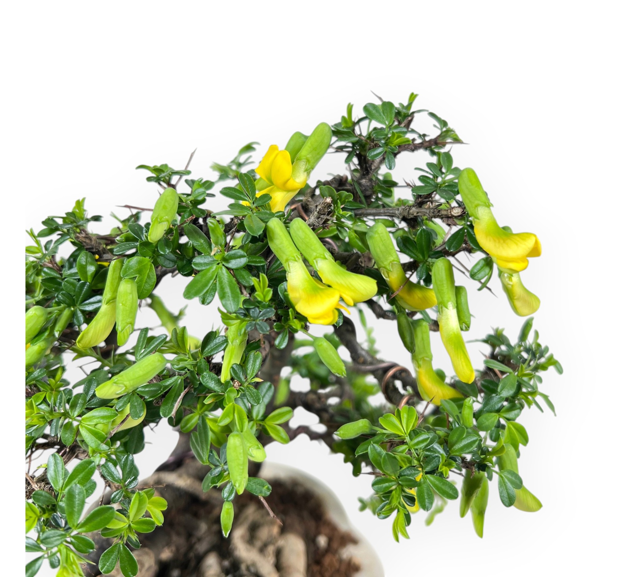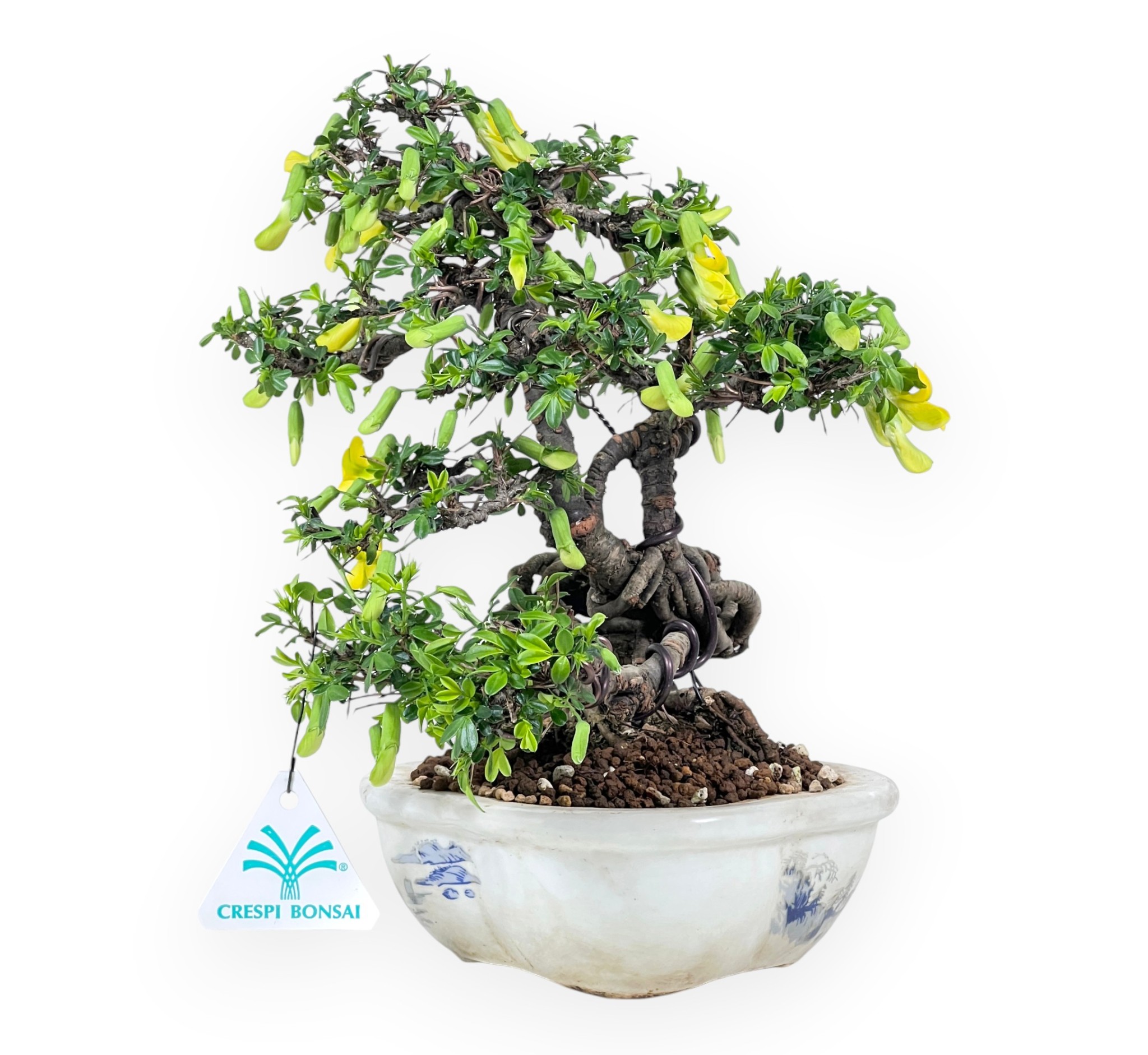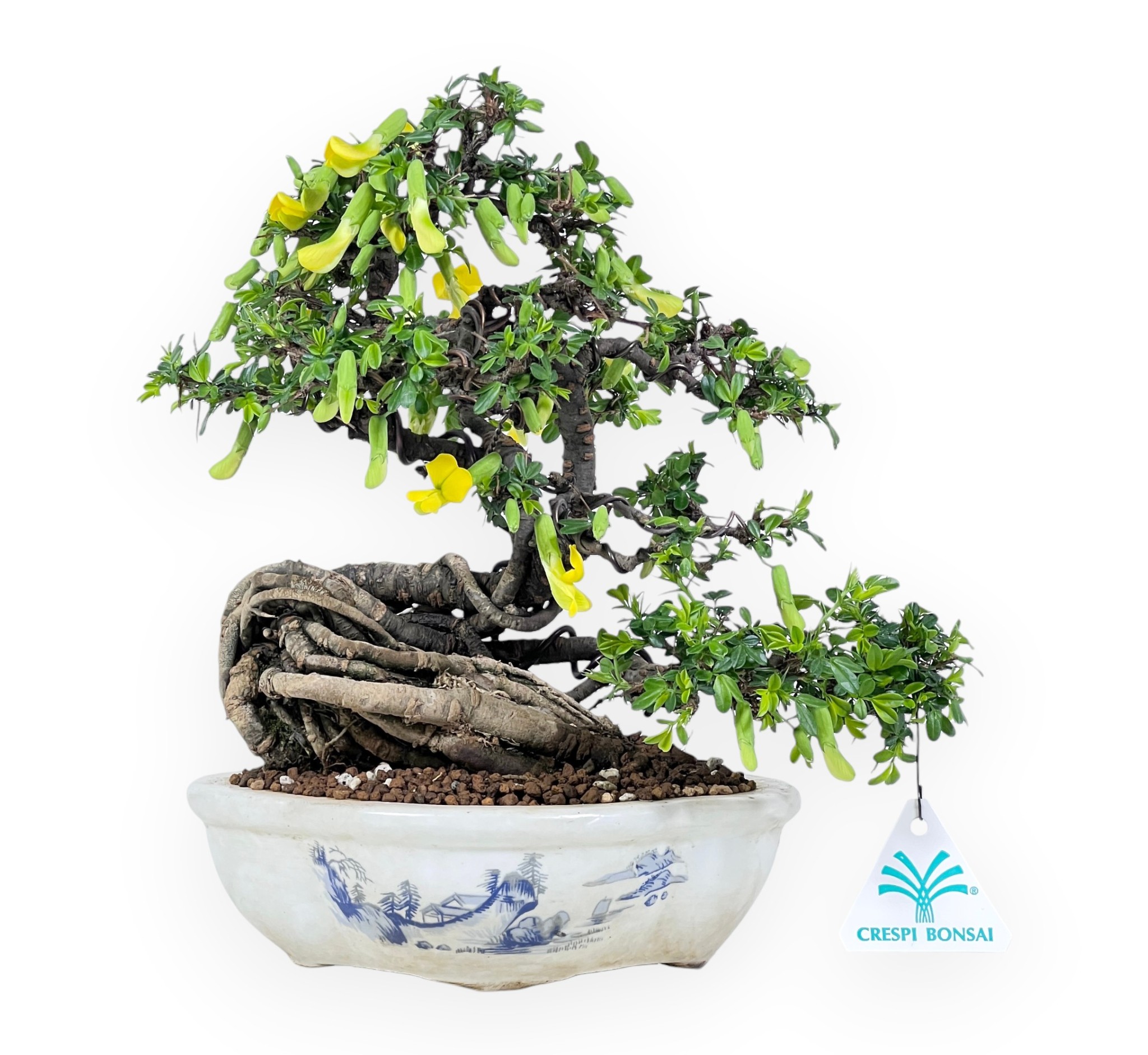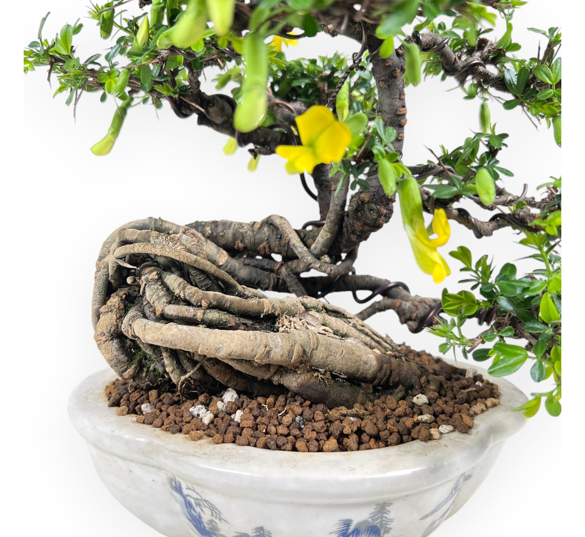 Le bonsaï de Caragana, à feuilles caduques avec fleurs, est apprécié pour sa robustesse et ses délicates fleurs jaunes. Le feuillage se compose de petites feuilles ovales, d'un vert vif au printemps et en été. En automne, le feuillage devient jaune orangé et perd ses feuilles en hiver. Le tronc est très solide et les racines sont apparentes, ce qui souligne la force et la maturité de la plante. Il présente un style de racines apparentes (neagari), une technique qui met l'accent sur les racines, qui s'étendent hors du substrat de manière naturelle et harmonieuse, créant un effet sculptural et dynamique. Cultivé dans un pot à nuage en grès émaillé crème, orné de décorations bleu représentant des paysages orientaux typiques, il met en valeur couleur des fleurs et des feuilles et crée un contraste élégant avec la structure du tronc.