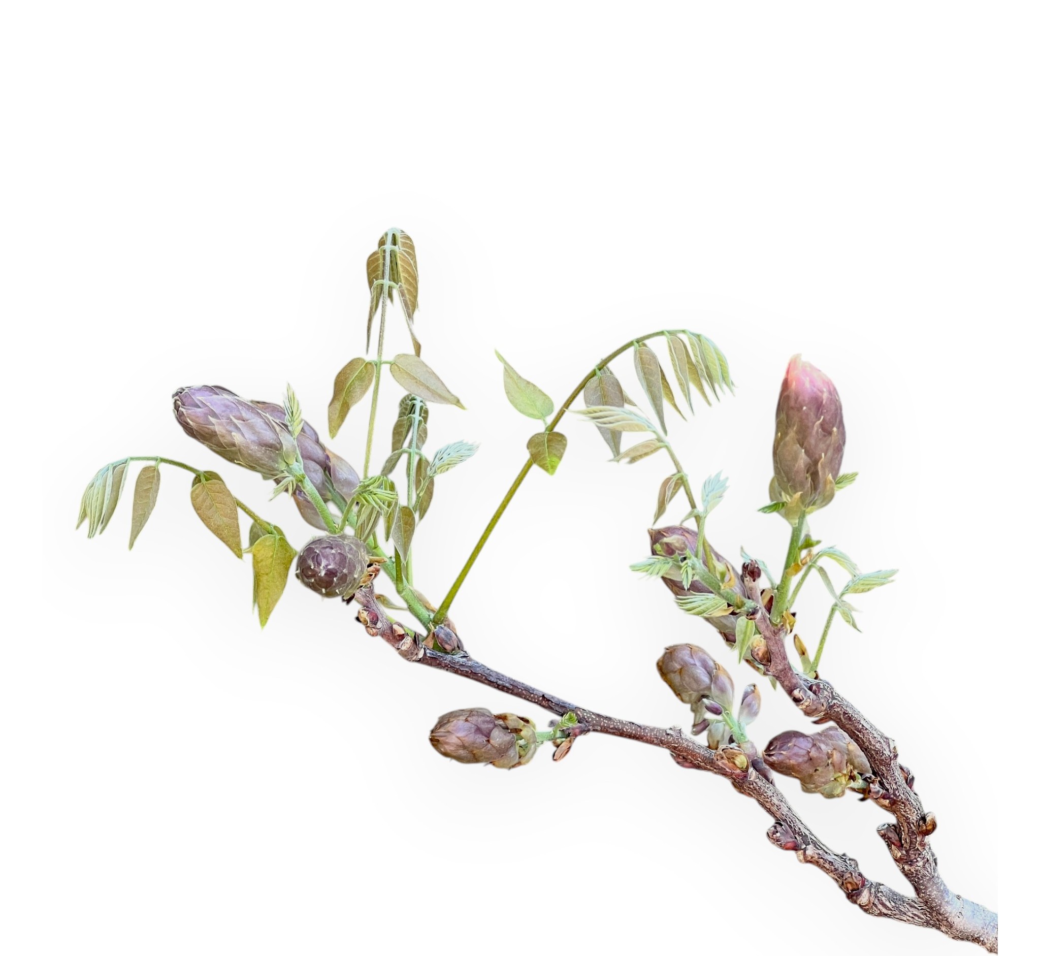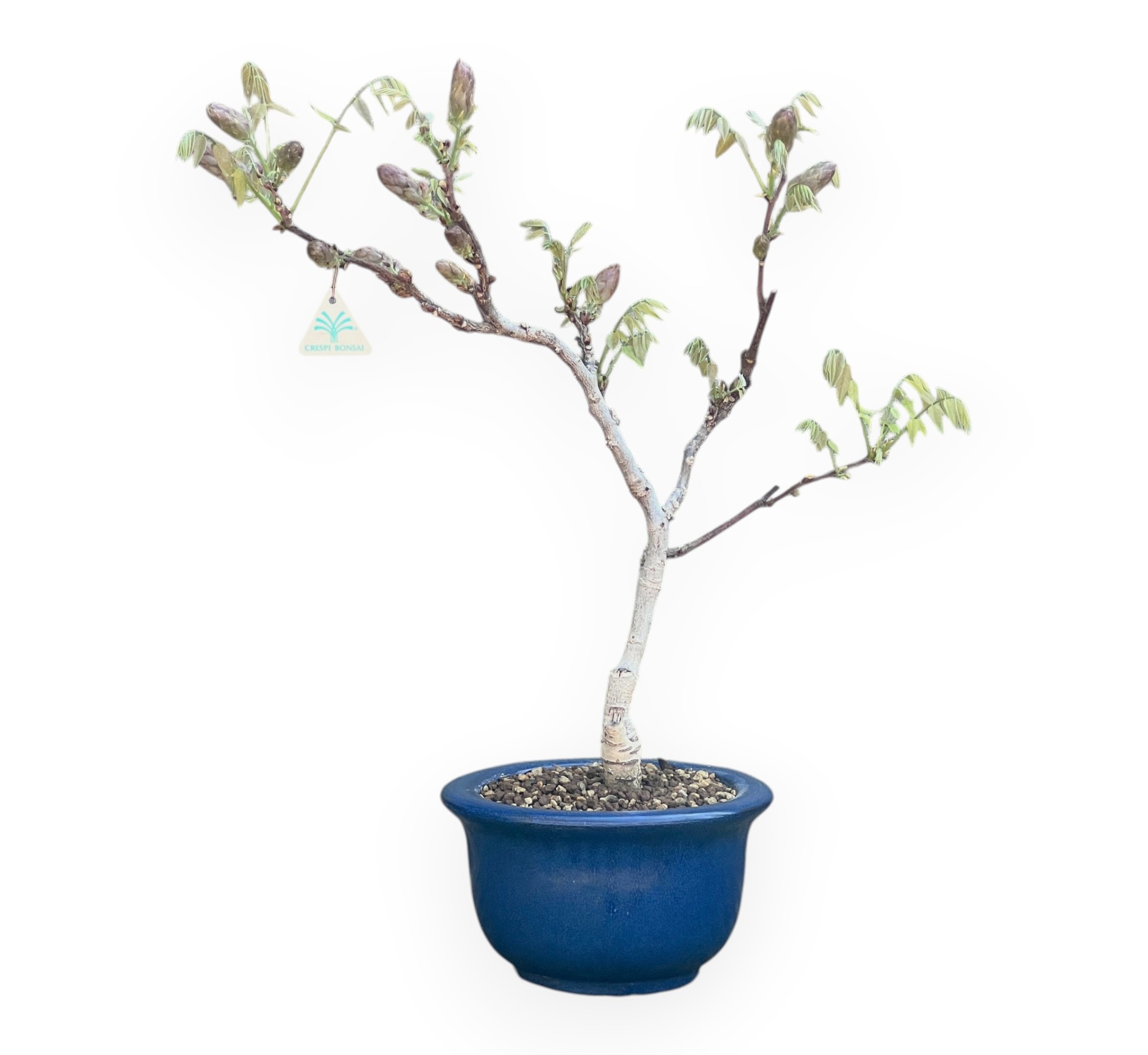 Bonsaï de Wisteria floribunda, une espèce à fleurs caduques, connue pour sa floraison printanière spectaculaire. Au printemps, elle produit les boutons floraux caractéristiques, qui se développent avant ou en même temps que les feuilles. La floraison est le moment le plus spectaculaire: les longues grappes pendantes de fleurs violettes-lilas parfumées créent un effet de légèreté et d'élégance. Les feuilles vertes s'ouvrent progressivement, accompagnant la floraison sans jamais la dominer. En été, après la floraison, la végétation s'épaissit pour former un feuillage plus fourni, tandis qu'en automne, les feuilles jaunissent avant de tomber, laissant à nouveau apparaître la structure nue du bonsaï. Cultivé dans un pot rond en grès émaillé bleu, qui contraste élégamment avec les teintes du feuillage et rappelle les tons de la floraison.