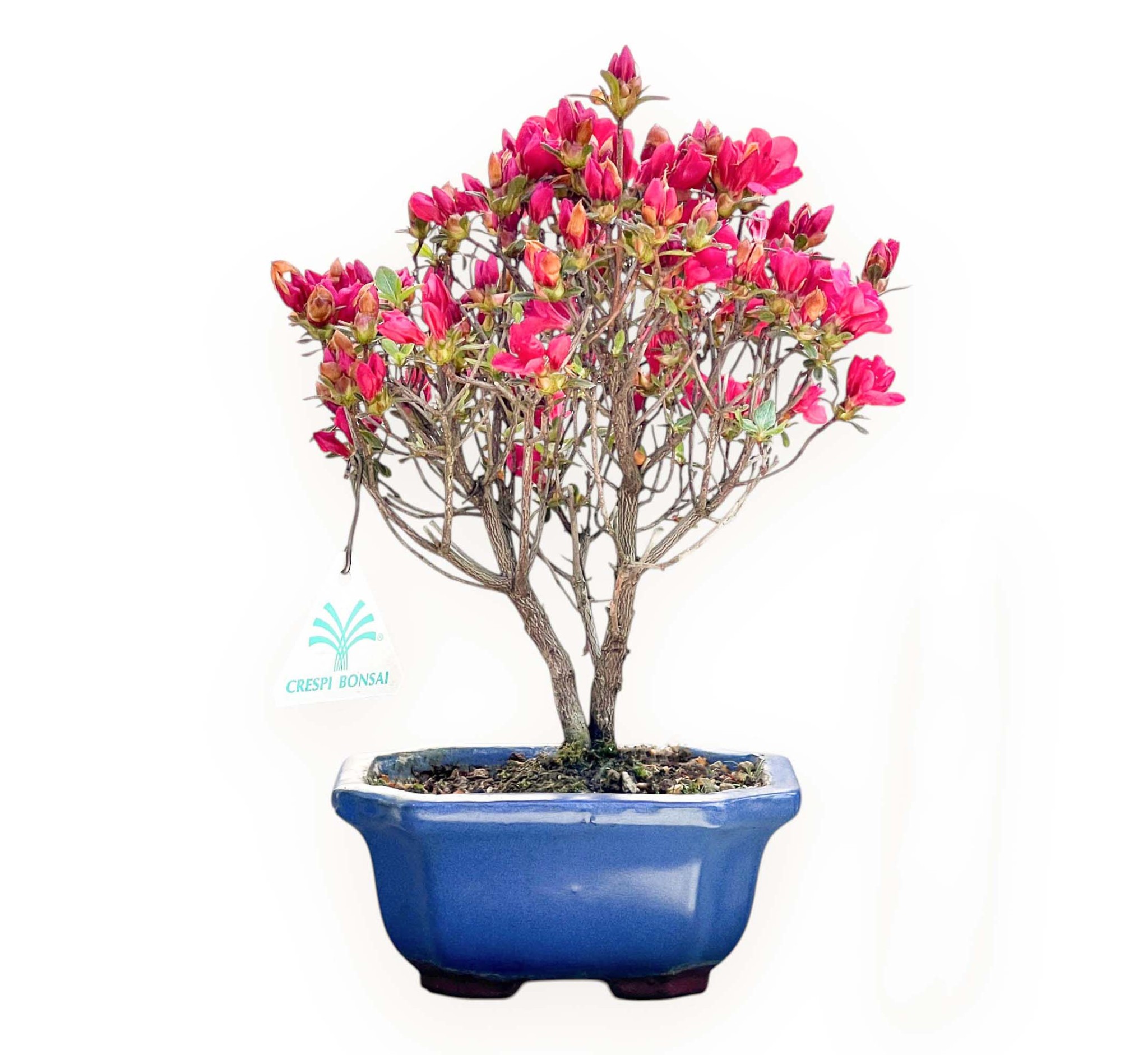 Bonsaï de Rhododendron indicum (azalée), à fleurs persistantes, se distingue par ses fleurs colorées. Il est apprécié pour sa floraison printanière fuchsia, qui crée un contraste élégant et vivant avec les feuilles vertes. Les feuilles sont petites, ovales et allongées, d'un vert vif pendant la saison de croissance. Comme il s'agit d'une plante à feuillage persistant, elle conserve son feuillage toute l'année; pendant les mois les plus froids, elle peut prendre des teintes plus sombres, tout en conservant un aspect décoratif. Le pot rectangulaire en grès émaillé bleu crée un contraste raffiné avec la couleur de la végétation, rehaussant la composition avec élégance.