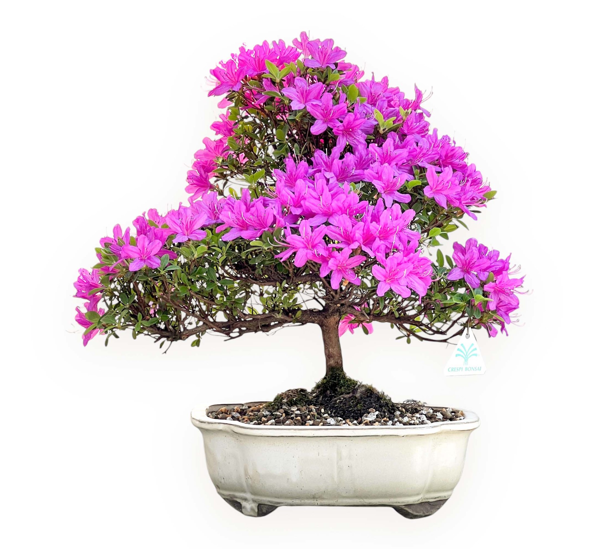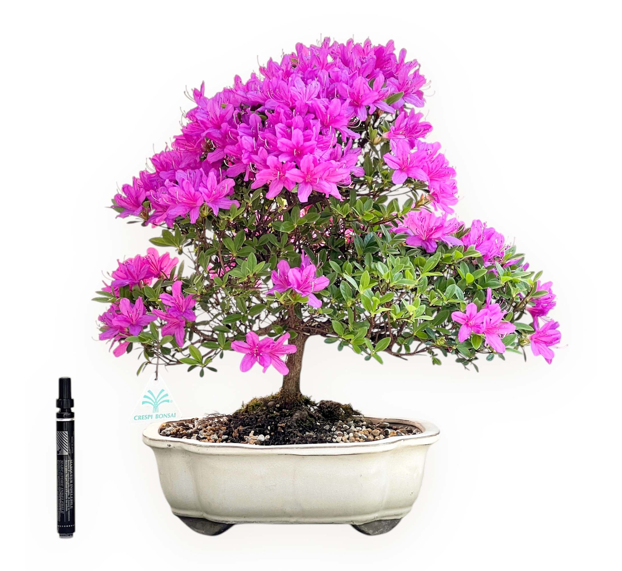 Bonsaï de Rhododendron indicum ryusei (azalée), un arbre à feuilles persistantes, se distingue par ses fleurs colorées. Il est apprécié pour sa floraison printanière fuchsia, qui crée un contraste élégant et vivant avec les feuilles vertes. Les feuilles sont petites et ovales, d'un vert vif pendant la saison de croissance. Comme il s'agit d'une plante à feuillage persistant, elle conserve son feuillage toute l'année; pendant les mois les plus froids, elle peut prendre des teintes plus foncées ou bronzées, tout en conservant un aspect décoratif. Cultivé dans un pot à nuage en grès émaillé crème complète le bonsaï en rehaussant la beauté de la plante, en lui apportant équilibre et raffinement.