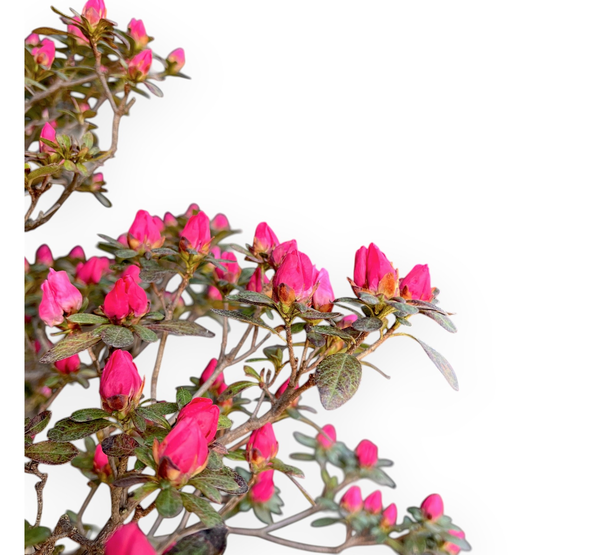Le bonsaï de Rhododendron indicum benikomachi (azalée), un arbre à feuilles persistantes, se distingue par ses fleurs colorées. Il est apprécié pour sa floraison printanière rose foncé à fuchsia, qui crée un contraste élégant et vivant avec les feuilles vertes. Les feuilles sont petites et ovales, d'un vert vif pendant la saison de croissance. Comme il s'agit d'une plante à feuillage persistant, elle conserve son feuillage toute l'année; pendant les mois les plus froids, elle peut prendre des teintes plus foncées ou bronzées, tout en conservant un aspect décoratif. Cultivé dans un pot rond en plastique marron.