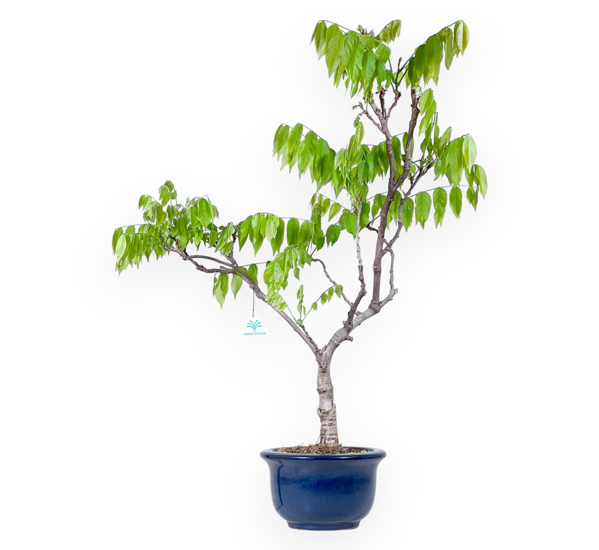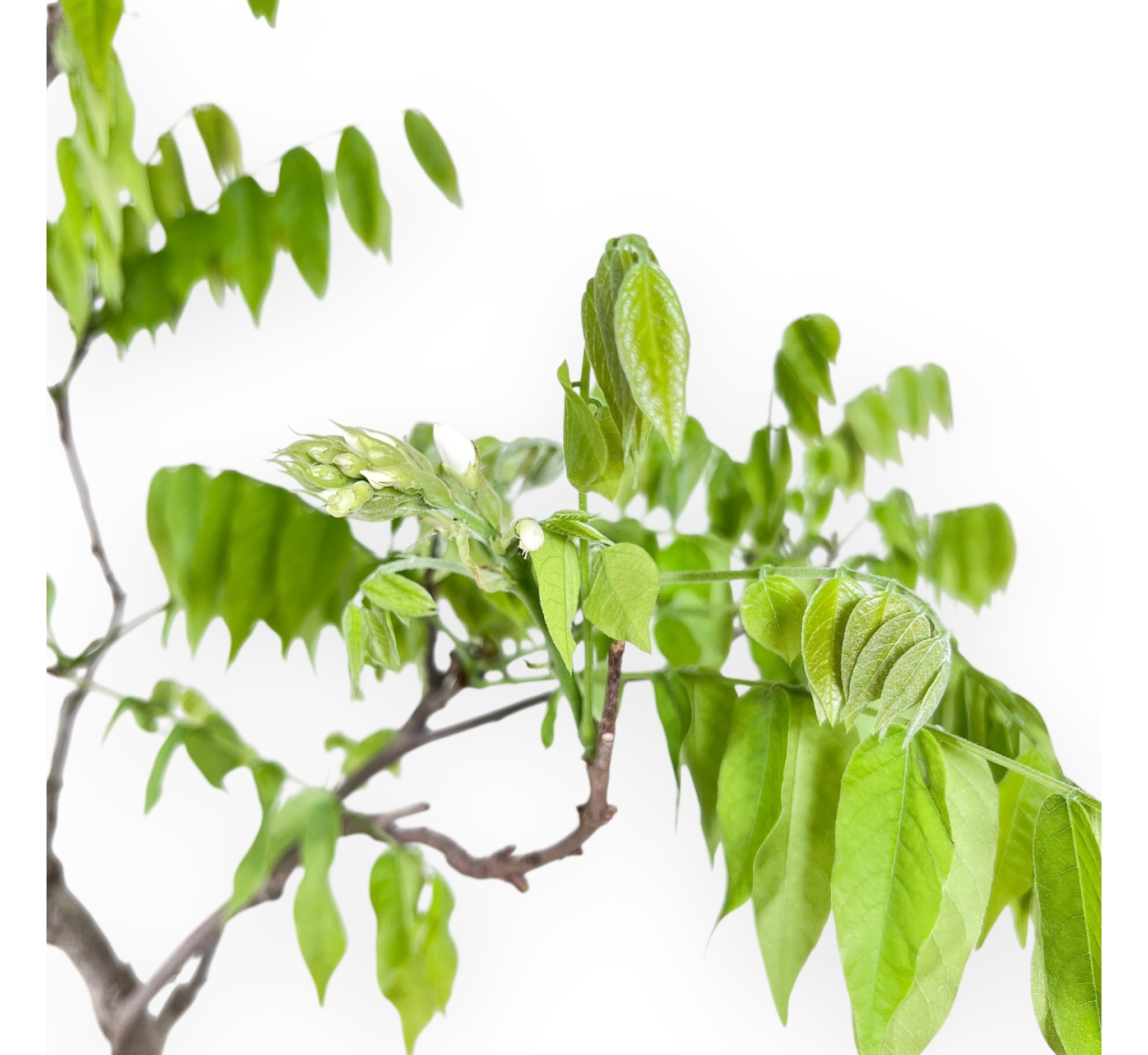 Bonsaï de Wisteria floribunda, une espèce à fleurs caduques, connue pour sa floraison printanière spectaculaire. Au printemps, elle produit les boutons floraux caractéristiques, qui se développent avant ou en même temps que les feuilles. La floraison est le moment le plus spectaculaire: les longues grappes pendantes de fleurs blanc parfumées, créent un effet de légèreté et d'élégance. Les feuilles vertes s'ouvrent progressivement, accompagnant la floraison sans jamais la dominer. En été, après la floraison, la végétation s'épaissit pour former un feuillage plus fourni, tandis qu'en automne, les feuilles jaunissent avant de tomber, laissant à nouveau apparaître la structure nue du bonsaï. Son tronc légèrement incliné donne du mouvement à la composition. Cultivé dans un pot rond en grès émaillé bleu, qui contraste élégamment avec les teintes du feuillage et rappelle les tons de la floraison.