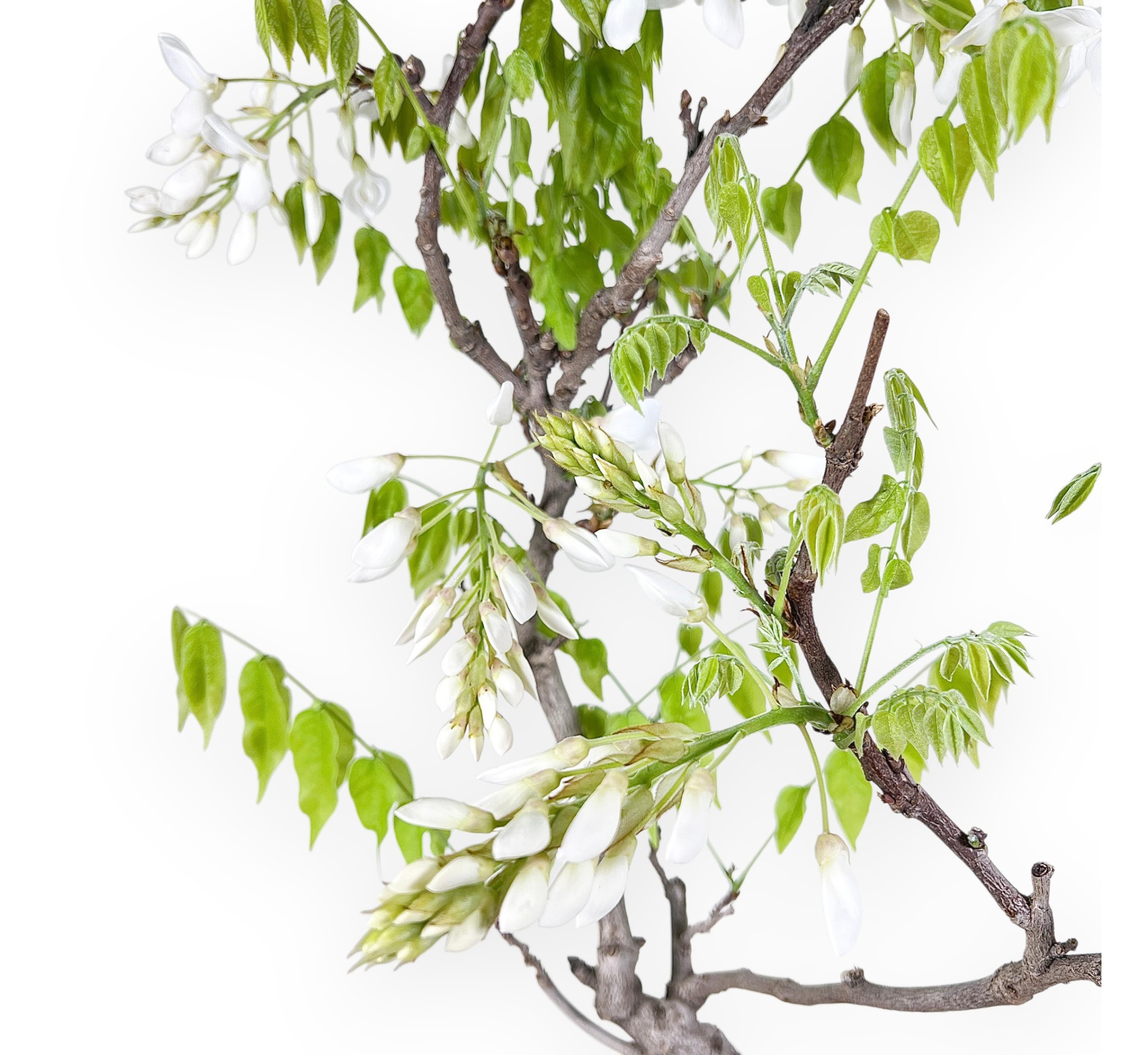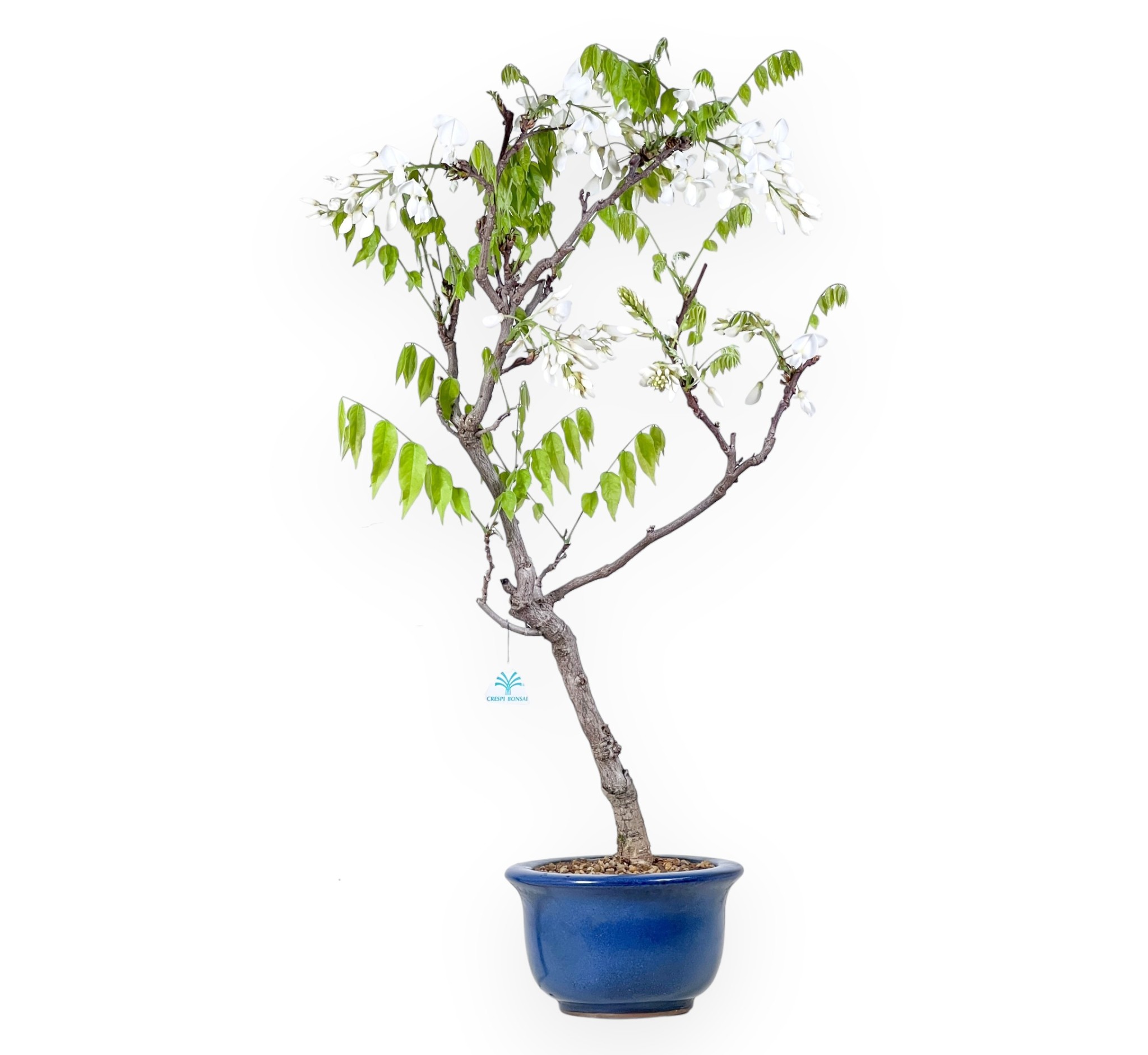Bonsaï de Wisteria floribunda, une espèce à fleurs caduques, connue pour sa floraison printanière spectaculaire. Au printemps, elle produit les boutons floraux caractéristiques, qui se développent avant ou en même temps que les feuilles. La floraison est le moment le plus spectaculaire: les longues grappes pendantes de fleurs blanc parfumées, créent un effet de légèreté et d'élégance. Les feuilles vertes s'ouvrent progressivement, accompagnant la floraison sans jamais la dominer. En été, après la floraison, la végétation s'épaissit pour former un feuillage plus fourni, tandis qu'en automne, les feuilles jaunissent avant de tomber, laissant à nouveau apparaître la structure nue du bonsaï. Son tronc légèrement incliné donne du mouvement à la composition. Cultivé dans un pot rond en grès émaillé bleu, qui contraste élégamment avec les teintes du feuillage et rappelle les tons de la floraison.