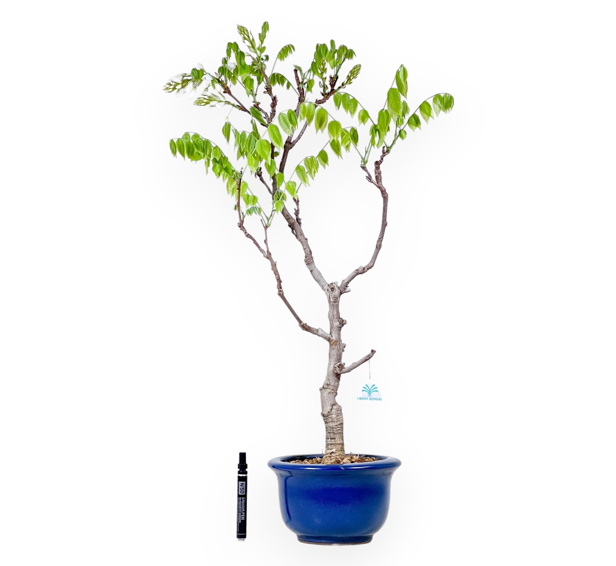 Bonsaï de Wisteria floribunda, une espèce à fleurs caduques, connue pour sa floraison printanière spectaculaire. Au printemps, elle produit les boutons floraux caractéristiques, qui se développent avant ou en même temps que les feuilles. La floraison est le moment le plus spectaculaire: les longues grappes pendantes de fleurs blanc parfumées, créent un effet de légèreté et d'élégance. Les feuilles vertes s'ouvrent progressivement, accompagnant la floraison sans jamais la dominer. En été, après la floraison, la végétation s'épaissit pour former un feuillage plus fourni, tandis qu'en automne, les feuilles jaunissent avant de tomber, laissant à nouveau apparaître la structure nue du bonsaï. Son tronc légèrement incliné donne du mouvement à la composition. Cultivé dans un pot rond en grès émaillé bleu, qui contraste élégamment avec les teintes du feuillage et rappelle les tons de la floraison.