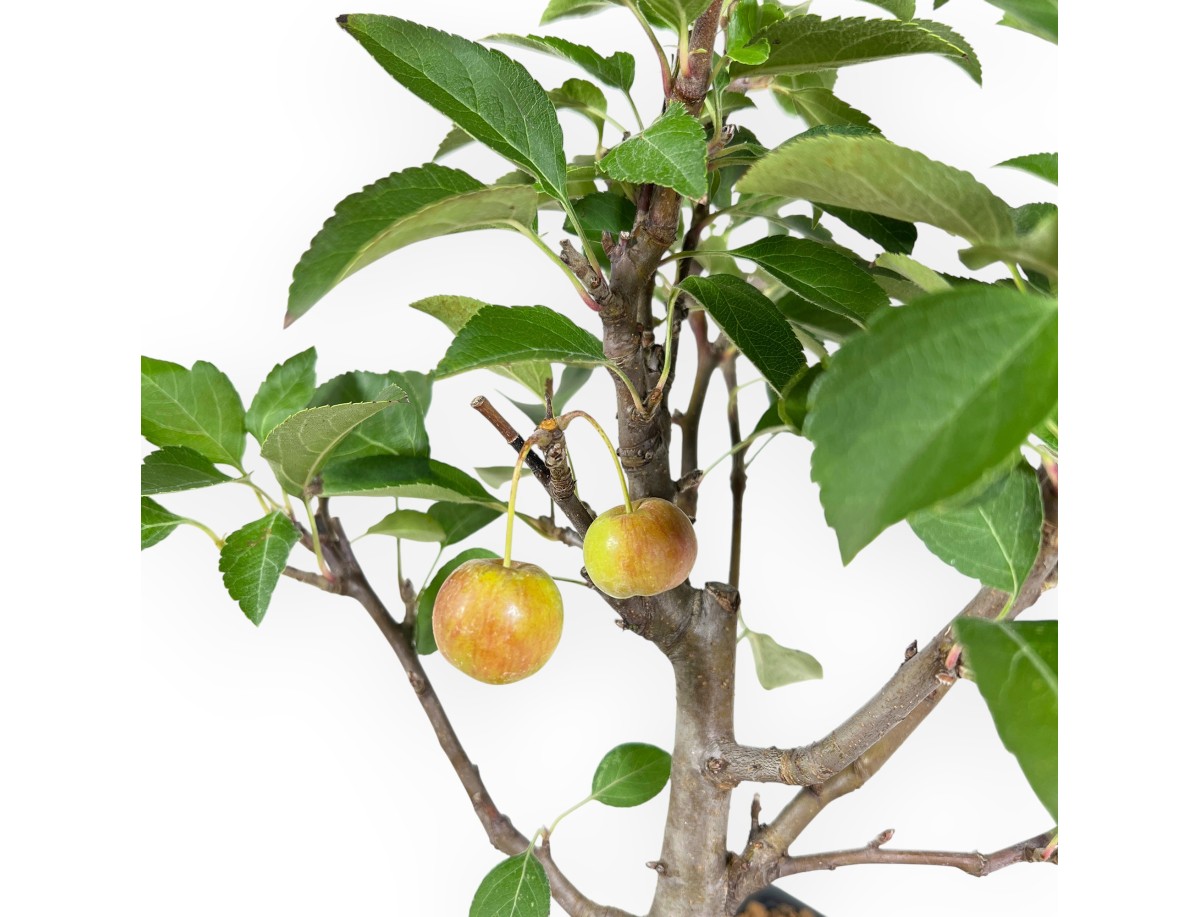 Bonsaï de pommier caractérisé par une hauteur hors pot de 26 cm, et une taille de tronc de 2 cm. La plante est cultivée dans un pot rectangulaire en grès émaillé dont les dimensions sont 15x11xH6 cm.