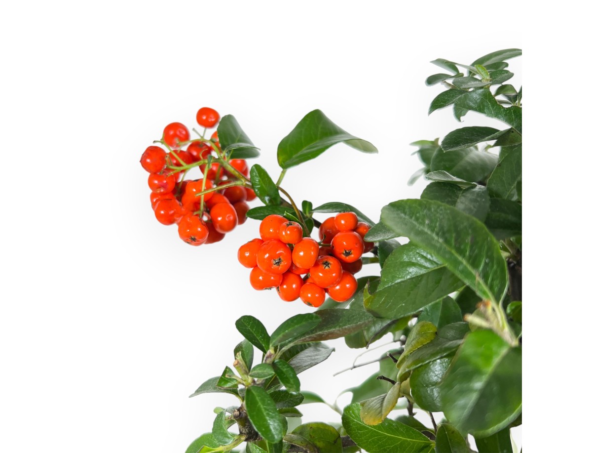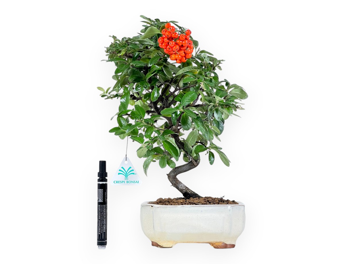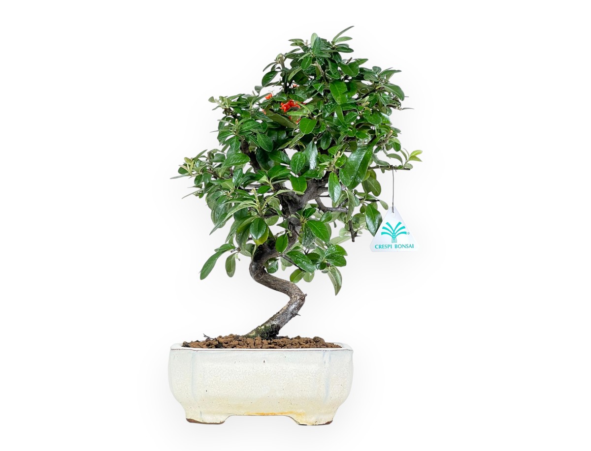 Ce bonsaï Pyracantha appartenant à la variété fruitière à feuillage persistant est apprécié pour sa floraison blanche au printemps et la production de baies orange vif en automne-hiver. Il est cultivé dans un pot rectangulaire aux angles arrondis en grès émaillé beige, ce qui lui confère une apparence élégante. Le tronc sinueux en forme de S et légèrement incliné donne une élégante impression de mouvement.