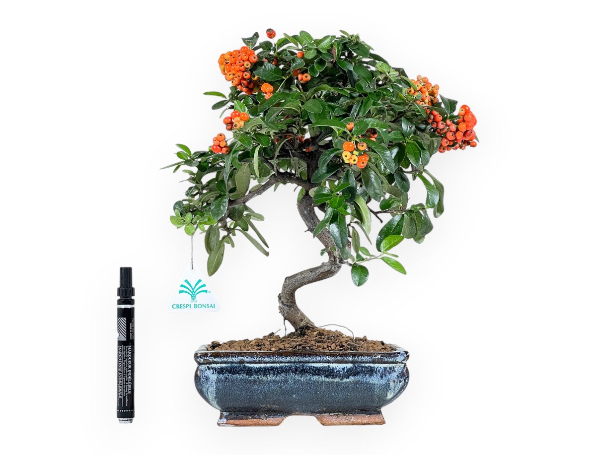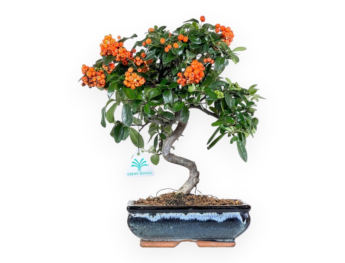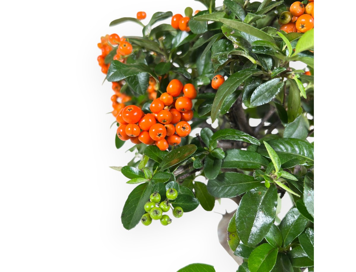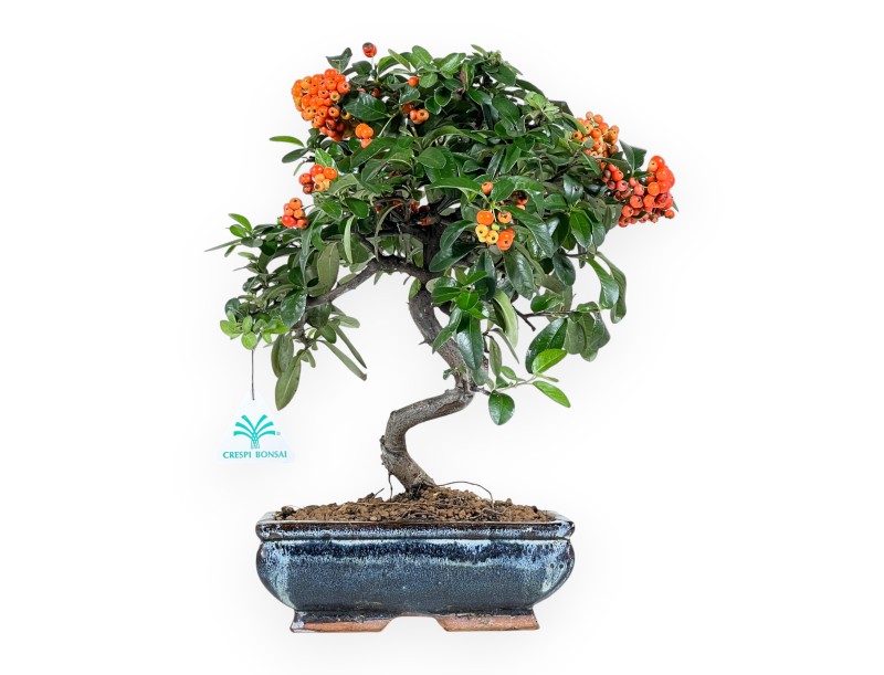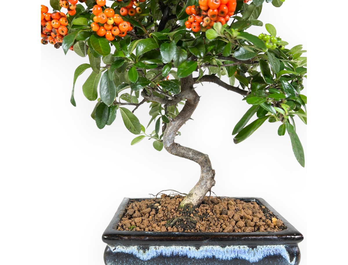 Ce bonsaï Pyracantha appartenant à la variété à fruits persistants est apprécié pour sa floraison blanche au printemps et la production de baies orange vif en automne-hiver. Il est cultivé dans un pot rectangulaire en grès émaillé bleu foncé avec des nuances plus claires et turquoises, qui donne de l'élégance et met en valeur le feuillage vert foncé et les baies orange.
