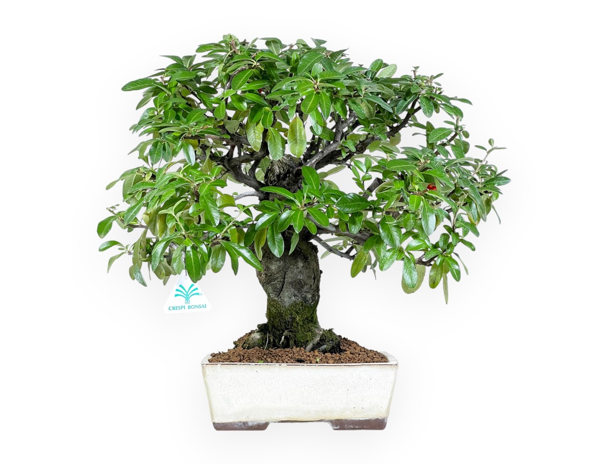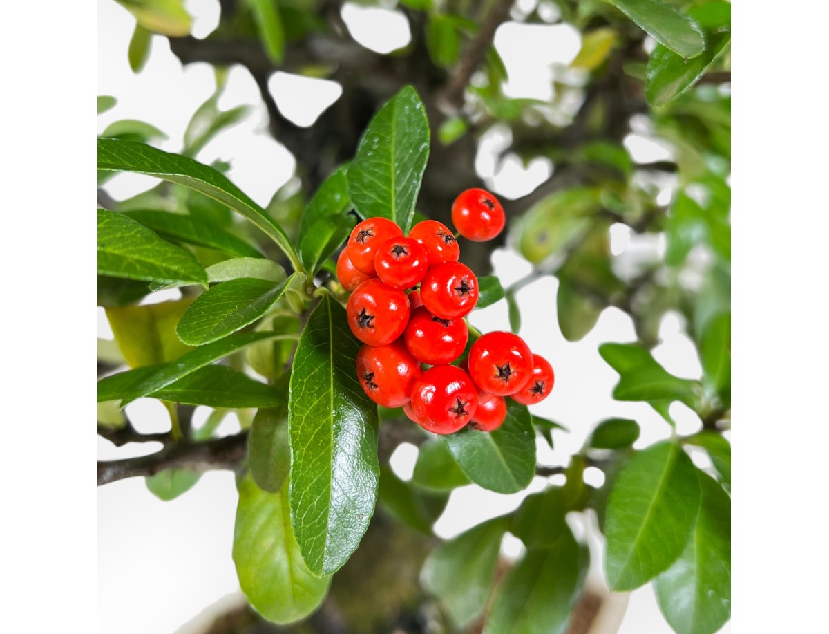Ce bonsaï Pyracantha appartenant à la variété fruitière à feuillage persistant est apprécié pour sa floraison blanche au printemps et la production de baies rouge ou orange vif en automne-hiver. Il est cultivé dans un pot rectangulaire en grès émaillé beige, ce qui lui confère une apparence élégante.