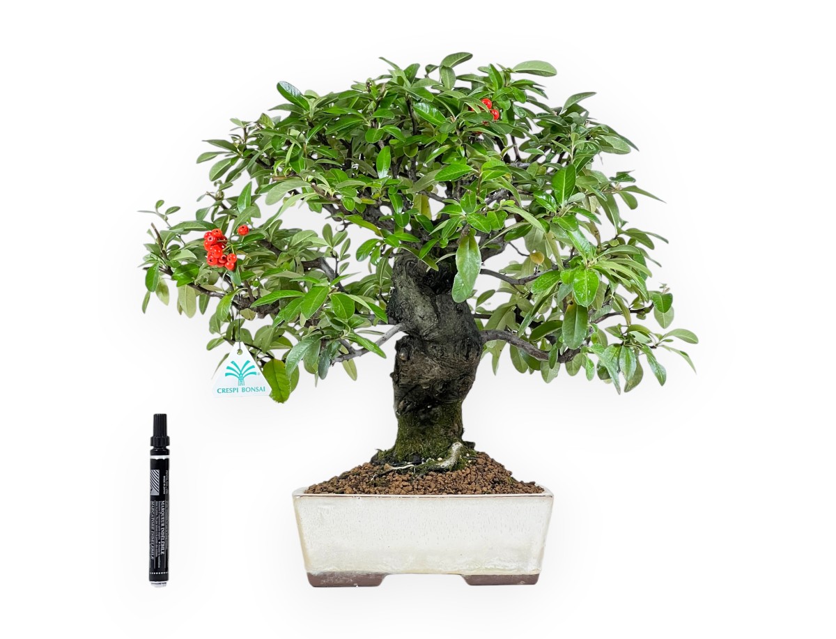 Bonzaï Pyracantha caractérisé par une hauteur sans pot de 36 cm, un tronc de 5,5 cm et un nebari de 10 cm. La plante est cultivée dans un pot rectangulaire en grès émaillé dont les dimensions sont de 20,5x14,5xH7 cm.