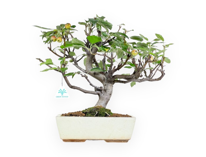 Bonsaï de pommier caractérisé par une hauteur hors pot de 31 cm, un tronc de 3 cm et un nebari de 9 cm. La plante est cultivée dans un pot rectangulaire en grès émaillé dont les dimensions sont 23x15xH8 cm.