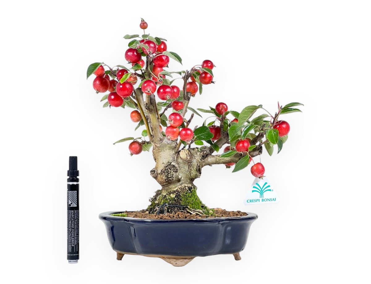 Bonsaï de pommier caractérisé par une hauteur sans pot de 25 cm, un tronc de 4 cm et un nebari de 8 cm. La plante est cultivée dans un pot nuage en grès émaillé dont les dimensions sont 20x16,5xH6 cm.