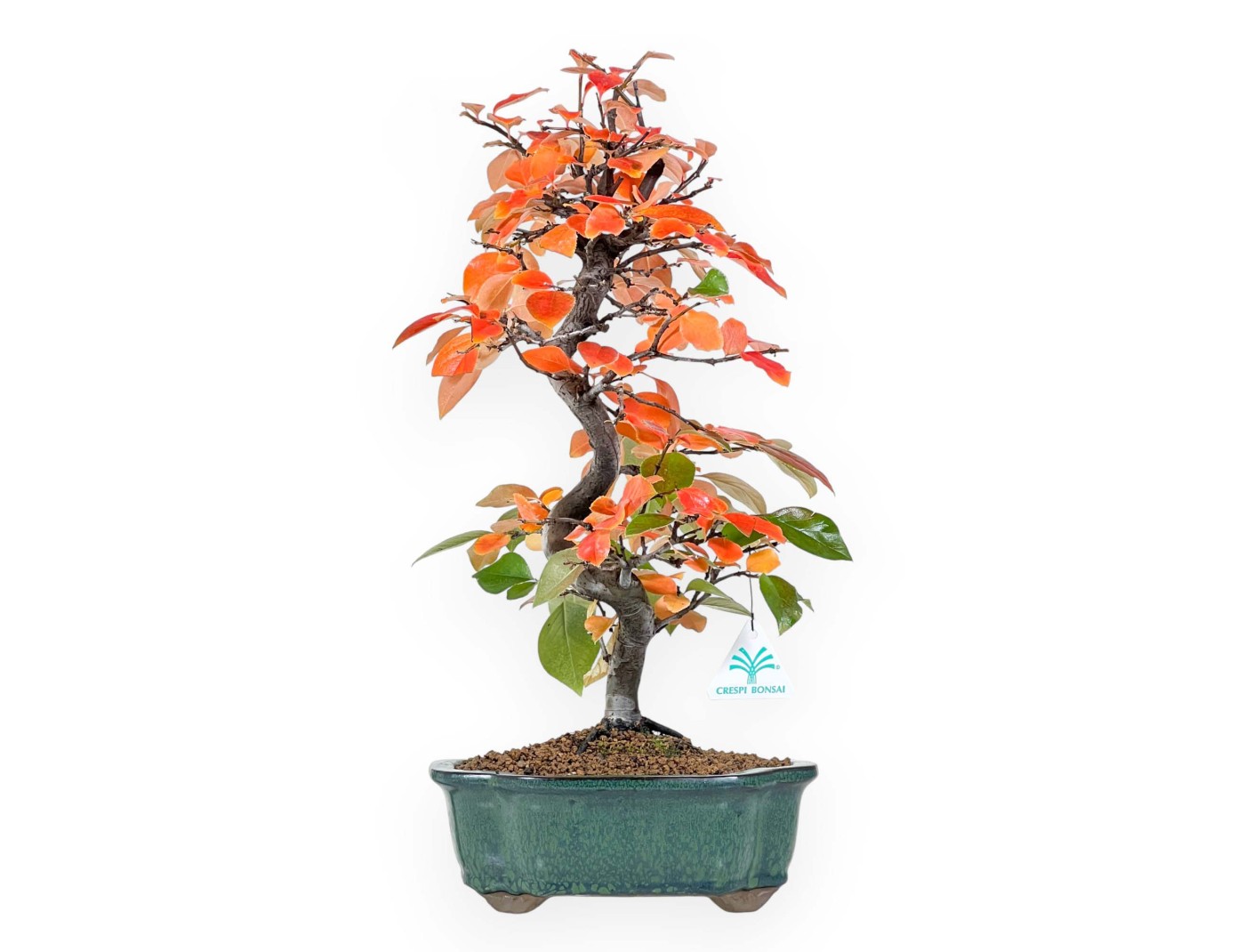 Ce bonsaï de Pseudocydonia chinensis (cognassier) appartenant à la variété des arbres fruitiers à feuilles caduques, se caractérise par des feuilles coriaces et des fruits allongés en forme de pomme, dont la couleur passe du vert au jaune doré lorsqu'ils sont mûrs. Les fleurs printanières sont blanc rosé, délicates et parfumées. Le feuillage vert foncé devient jaune orangé en automne et perd ses feuilles en hiver. Le pot à nuage en grès émaillé vert accentue le contraste avec les couleurs chaudes du feuillage et apporte de l'équilibre à l'ensemble.