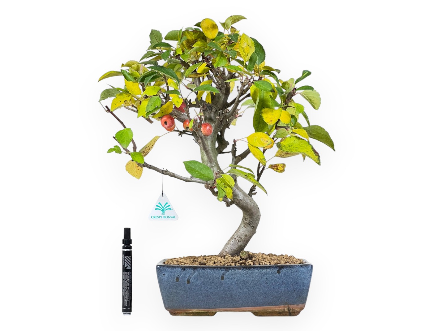 Le bonsaï de Malus (pommier) appartenant à la variété à fruits caducs, est apprécié pour sa floraison printanière blanc rosé et la production ultérieure de petites pommes, qui passent du jaune-vert au rouge lorsqu'elles sont mûres, donnant ainsi du caractère à l'arbre. Le feuillage devient jaune orangé en automne et perd ses feuilles en hiver. Le pot rectangulaire en grès émaillé bleu contraste élégamment avec les couleurs du feuillage et des fruits.