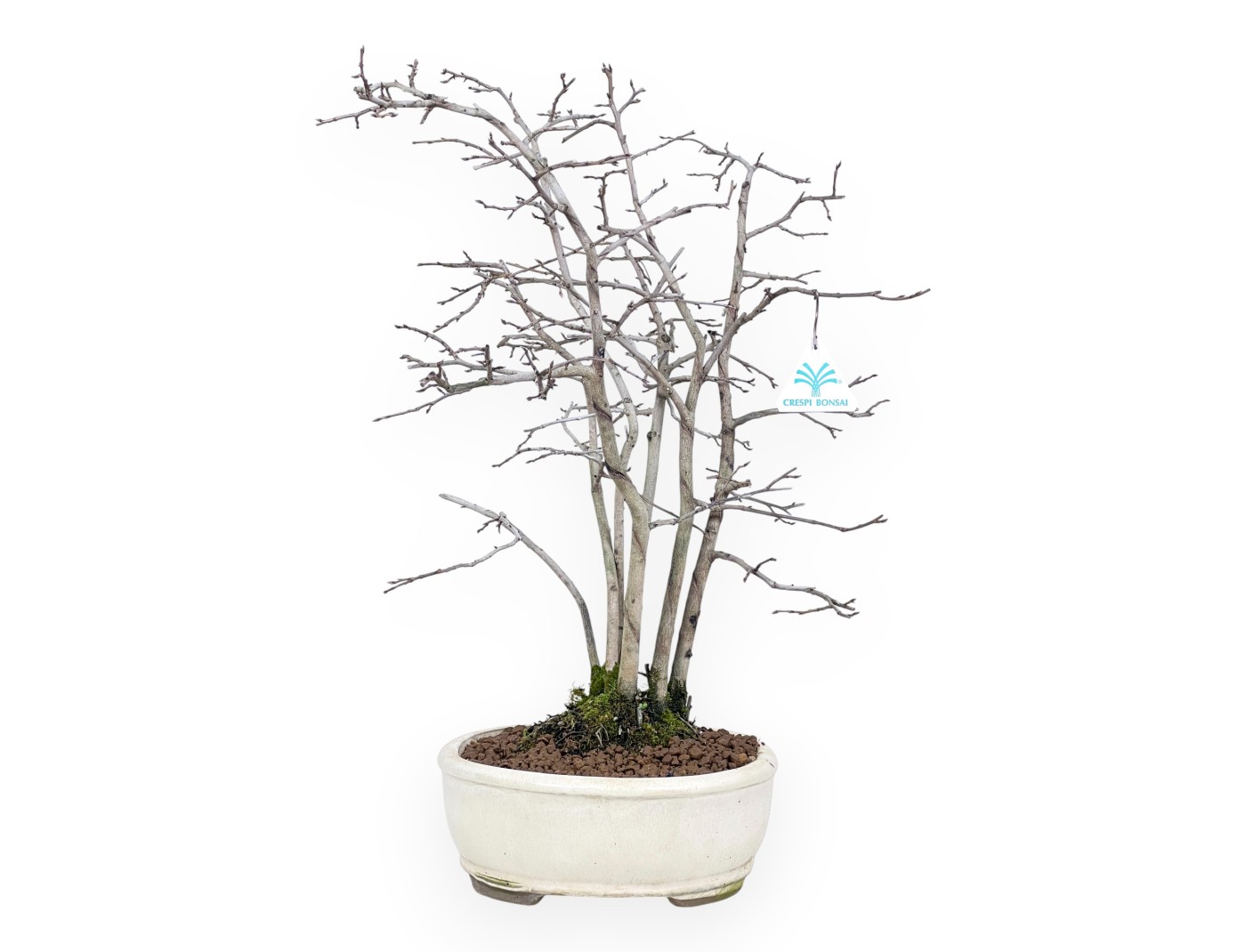 Le bonsaï de Diospyros kaki (Kaki), appartenant à la variété à fruits caducs, est une variété qui se caractérise par sa rusticité et sa production de fruits sucrés. La floraison a lieu à la fin du printemps, avec de petites fleurs jaune crème, et est suivie par des fruits ornementaux orange à l'automne. Le feuillage, composé de feuilles ovales d'un vert brillant, devient jaune orangé en automne et perd ses feuilles en hiver. Modelé en style à forêt (Yose-ue), il est composé de plusieurs plantes dont les troncs de différentes hauteurs donnent de la profondeur, de l'équilibre et de l'harmonie. Cultivé dans un pot ovale en grès émaillé beige, qui souligne la beauté du bonsaï et crée un contraste agréable avec les feuilles vertes.