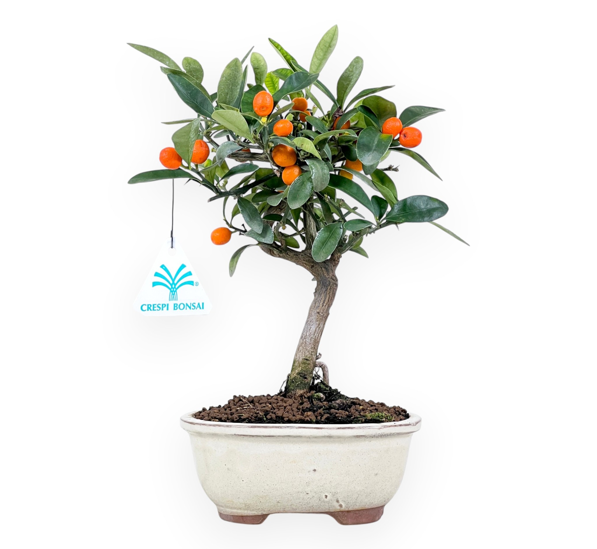 Le bonsaï de Citrus kinzu (mandarine chinoise), una espèce fruitier à feuilles persistantes, se caractérise par ses fruits semblables à des mandarines, d'une couleur orange vif qui contraste avec le vert des feuilles, et est apprécié pour sa croissance compacte et son aspect élégant. Dans des conditions climatiques favorables, au printemps, entre mars et mai, il produit des fleurs blanches. Les fruits commencent à se former après la floraison et atteignent leur maturité vers la fin de l'automne ou le début de l'hiver, selon les conditions climatiques, entre novembre et janvier. Son tronc légèrement tordu lui confère un aspect harmonieux et naturel. Cultivé dans un pot ovale en grès émaillé crème, il apporte une touche d'élégance et met en valeur son feuillage vert intense.