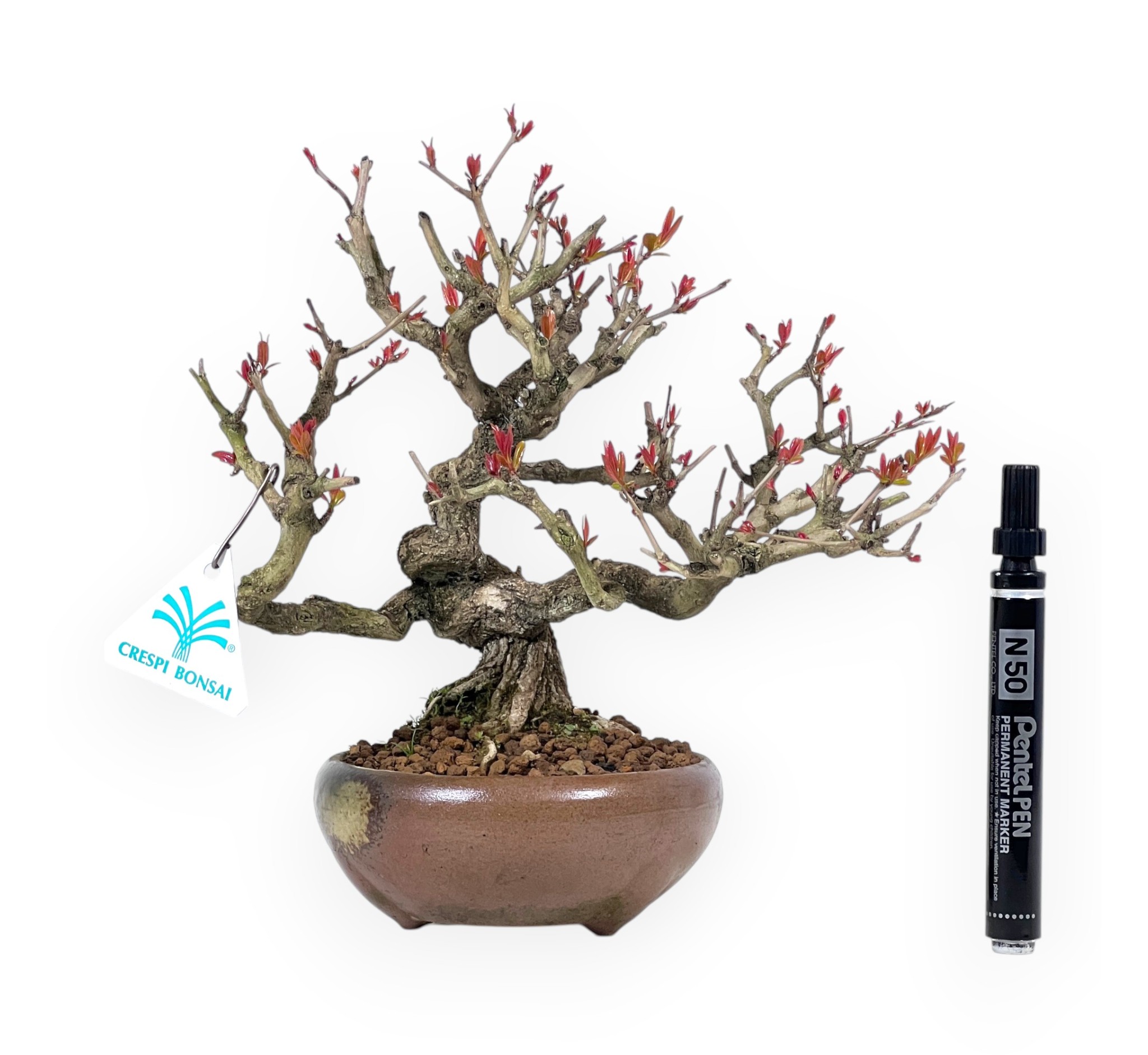 Bonsaï de Punica granatum (grenadier), un bonsai fruitier à feuilles caduques, apprécié pour sa capacité à combiner élégance, rusticité et spectaculaire saisonnier. Les feuilles, petites et lancéolées, apparaissent au printemps avec de jeunes pousses rouge-bronze très décoratives, d'un vert éclatant pendant la période de croissance, puis prennent des tons chauds jaune-orange à l'automne avant de tomber. Pendant l'hiver, la plante perd complètement ses feuilles, ce qui met en valeur la structure élégante du tronc et des branches. Entre la fin du printemps et l'été, elle produit des fleurs d'un rouge orangé vif, à la forme caractéristique et très ornementale. Si elle est cultivée dans de bonnes conditions, les fleurs sont suivies de fruits, les grenades, qui mûrissent vers la fin de l'été-automne, ce qui confère à la plante une valeur esthétique supplémentaire. Cultivé dans un pot rond en grès non émaillé, il crée un contraste de couleur raffiné avec les nuances du feuillage et donne au bonsaï une impression de naturel.