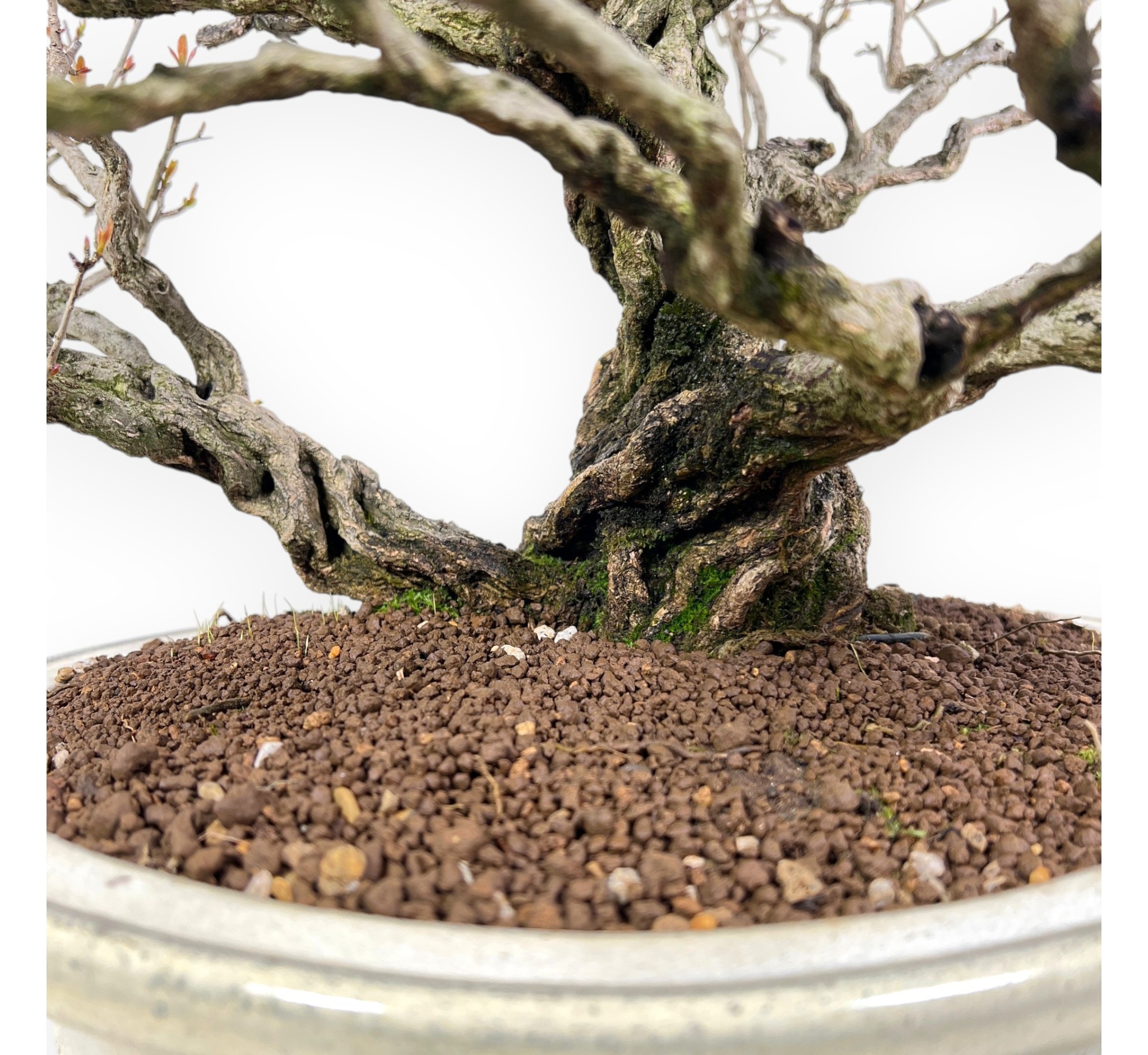 Bonsaï de Punica granatum (grenadier), un bonsai fruitier à feuilles caduques, apprécié pour sa capacité à combiner élégance, rusticité et spectaculaire saisonnier. Les feuilles, petites et lancéolées, apparaissent au printemps avec de jeunes pousses rouge-bronze très décoratives, d'un vert éclatant pendant la période de croissance, puis prennent des tons chauds jaune-orange à l'automne avant de tomber. Pendant l'hiver, la plante perd complètement ses feuilles, ce qui met en valeur la structure élégante du tronc et des branches. Entre la fin du printemps et l'été, elle produit des fleurs d'un rouge orangé vif, à la forme caractéristique et très ornementale. Si elle est cultivée dans de bonnes conditions, les fleurs sont suivies de fruits, les grenades, qui mûrissent vers la fin de l'été-automne, ce qui confère à la plante une valeur esthétique supplémentaire. Il présente un tronc sinueux, avec un feuillage dense et finement ramifié. Son écorce mature, rugueuse et sculptée, contribue à lui conférer une forte impression d'ancienneté et de caractère. Cultivé dans un pot ovale en grès émaillé crème, contraste élégamment avec les teintes du feuillage et des fleurs, dont il rehausse la beauté.