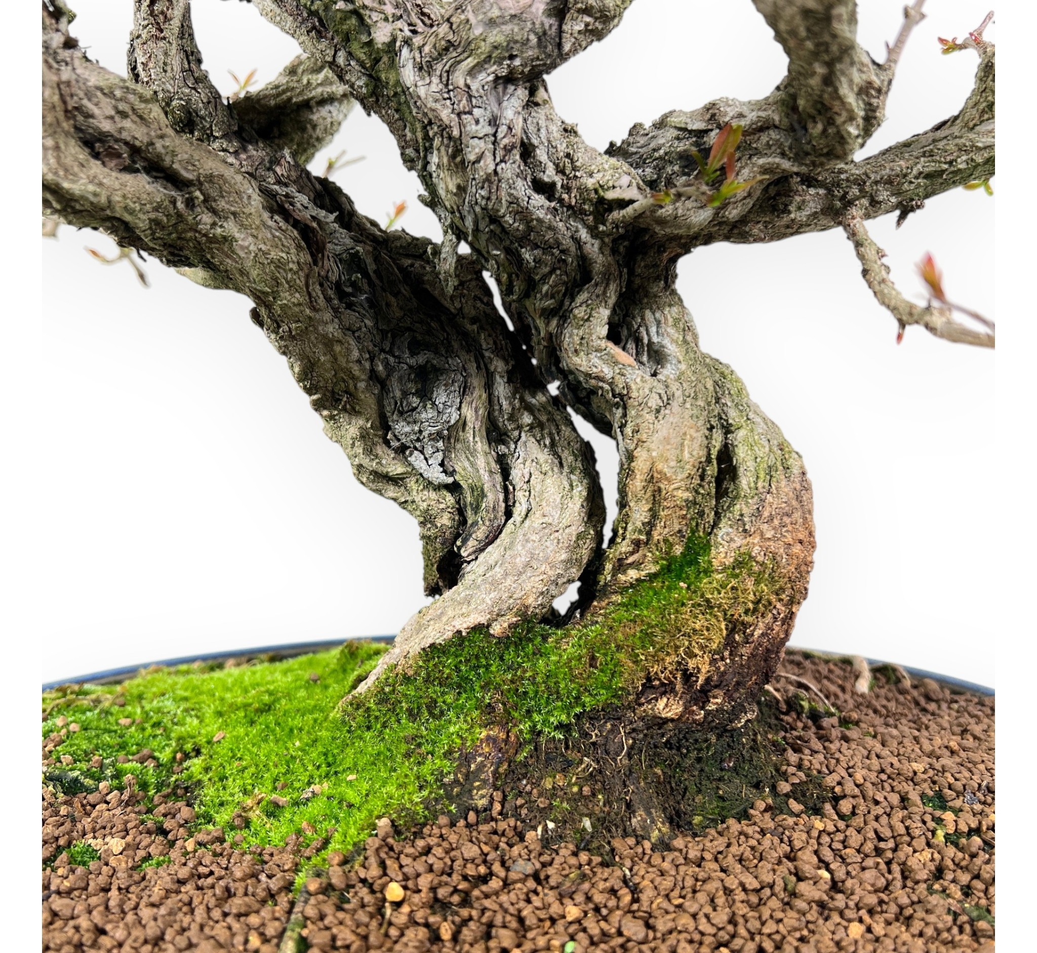 Bonsaï de Punica granatum (grenadier), un bonsai fruitier à feuilles caduques, apprécié pour sa capacité à combiner élégance, rusticité et spectaculaire saisonnier. Les feuilles, petites et lancéolées, apparaissent au printemps avec de jeunes pousses rouge-bronze très décoratives, d'un vert éclatant pendant la période de croissance, puis prennent des tons chauds jaune-orange à l'automne avant de tomber. Pendant l'hiver, la plante perd complètement ses feuilles, ce qui met en valeur la structure élégante du tronc et des branches. Entre la fin du printemps et l'été, elle produit des fleurs d'un rouge orangé vif, à la forme caractéristique et très ornementale. Si elle est cultivée dans de bonnes conditions, les fleurs sont suivies de fruits, les grenades, qui mûrissent vers la fin de l'été-automne, ce qui confère à la plante une valeur esthétique supplémentaire. Il présente un style à double tronc (Sokan), dans lequel deux troncs s'élèvent à partir d'une même base, créant ainsi une composition harmonieuse et naturelle. Les troncs sont recouverts d'une écorce rugueuse et pleine de relief, signe distinctif de leur âge et de leur caractère. Cultivé dans un pot ovale en grès émaillé bleu, crée un contraste raffiné avec la couleur de la végétation, rehaussant la composition avec élégance.