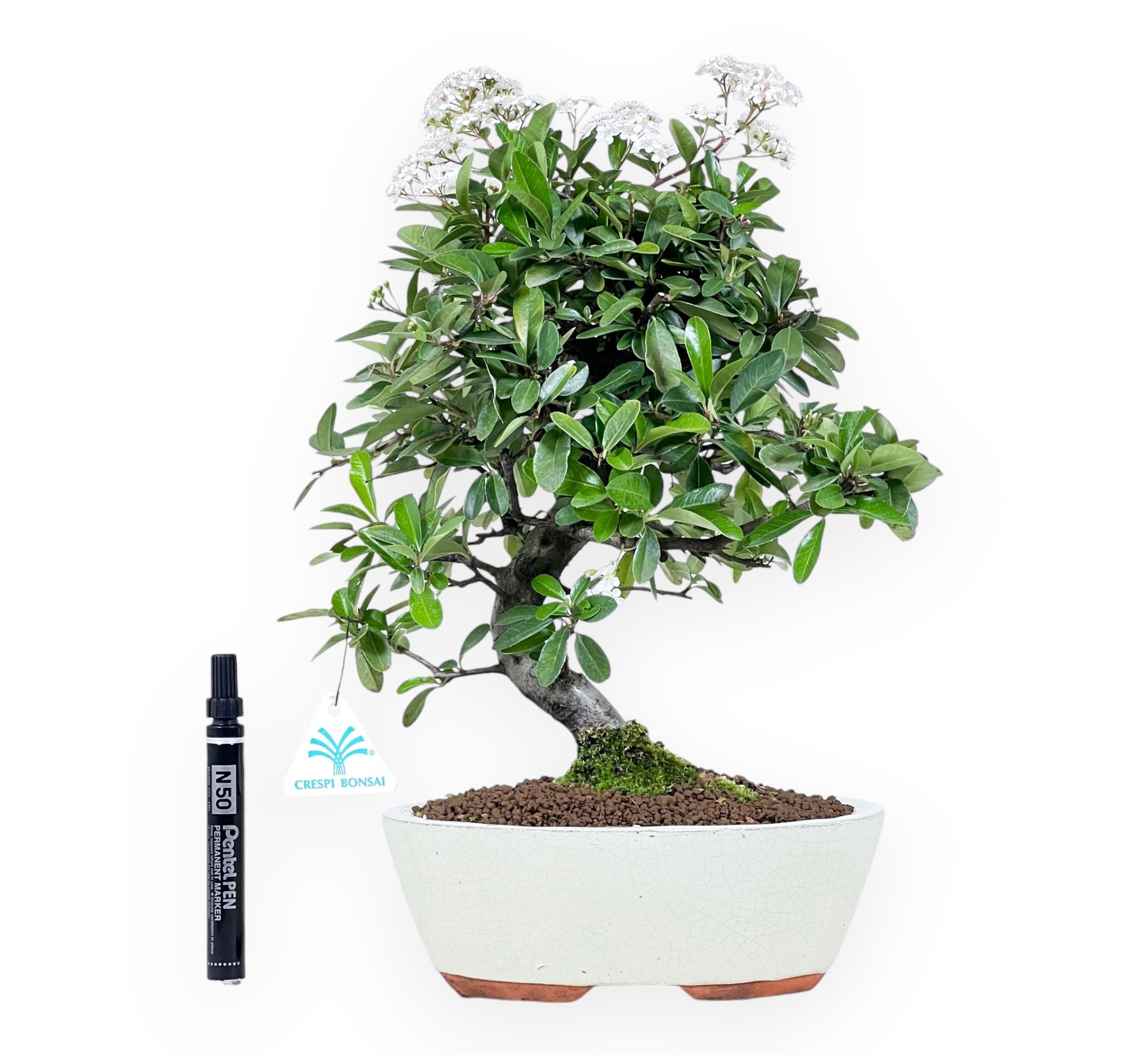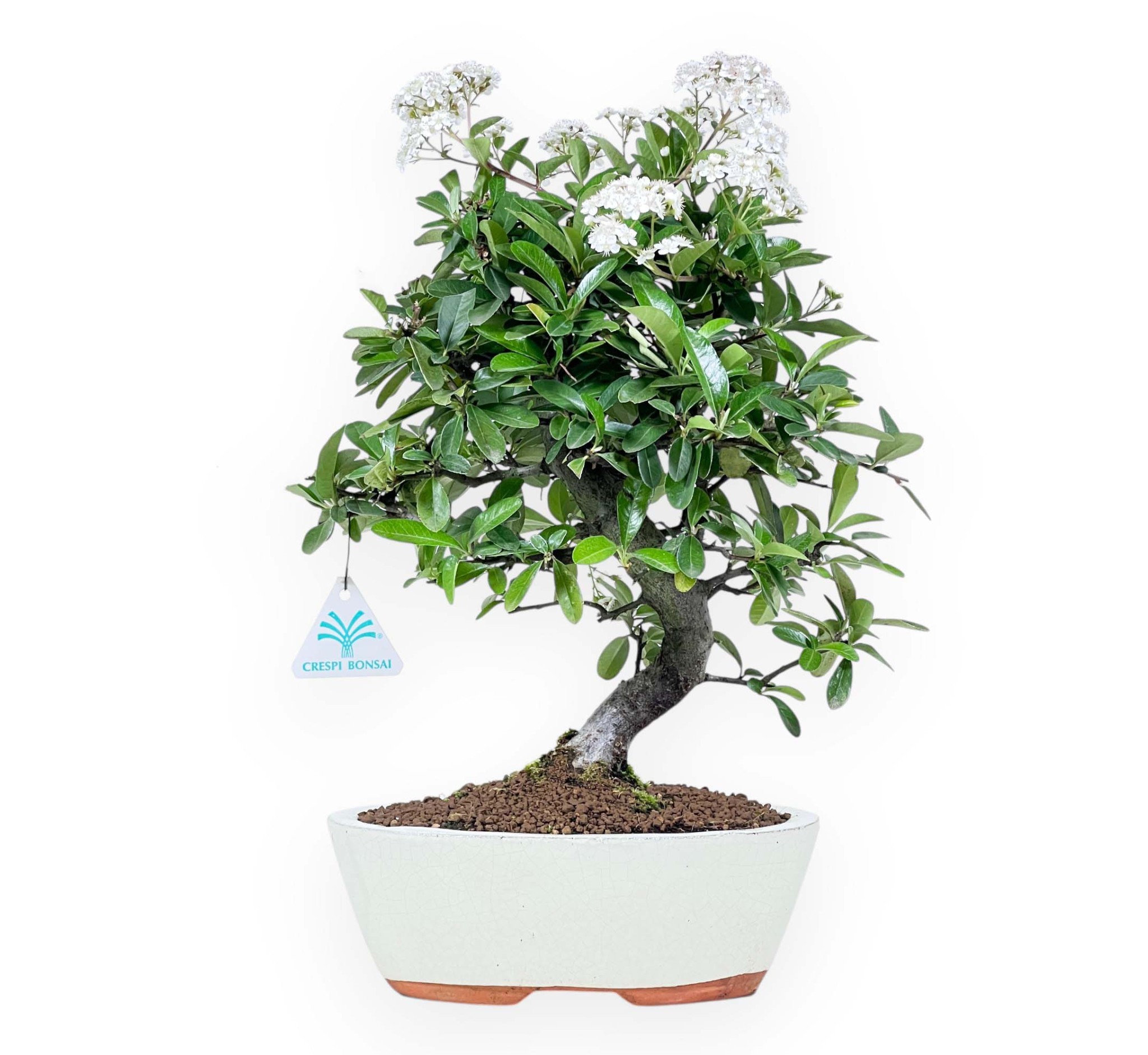 Bonsaï de Pyracantha, espèce fruitier à feuilles persistantes, apprécié pour sa floraison blanche au printemps et sa production de baies orange vif en automne-hiver. La couronne harmonieuse met en valeur la plante et soulignent sa beauté générale. Cultivé dans un pot ovale en grès émaillé crème, complète le bonsaï en rehaussant la beauté de la plante, en lui renferme un équilibre de couleurs qui met en valeur le feuillage vert foncé et les baies orange qui germeront dans les mois suivants.
