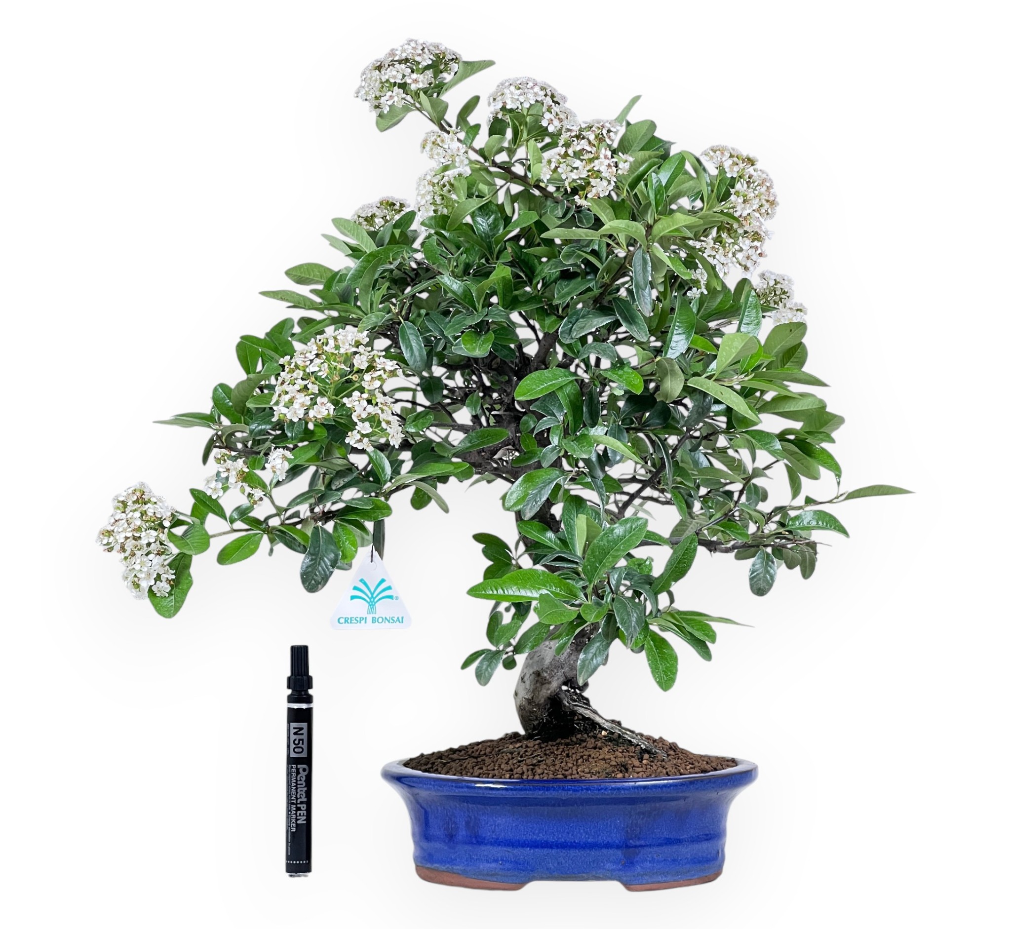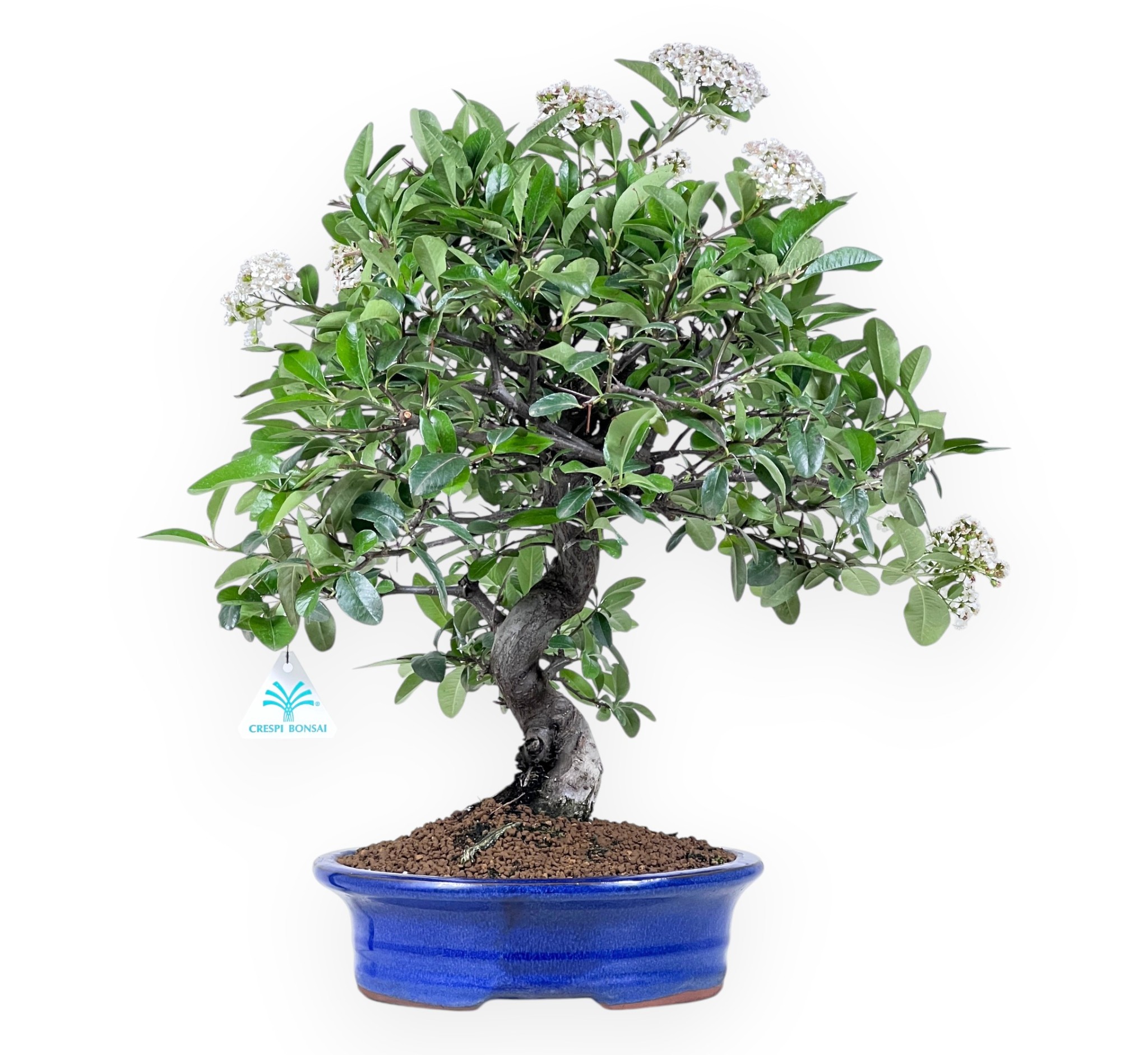 Bonsaï de Pyracantha, espèce fruitier à feuilles persistantes, apprécié pour sa floraison blanche au printemps et sa production de baies orange vif en automne-hiver. La couronne harmonieuse met en valeur la plante et soulignent sa beauté générale. Cultivé dans un pot ovale en grès émaillé bleu, il créent un contraste raffiné avec le vert éclatant du feuillage, tout en mettant en valeur la délicatesse des fleurs blanches et, pendant la période de fructification, la vivacité des baies colorées.