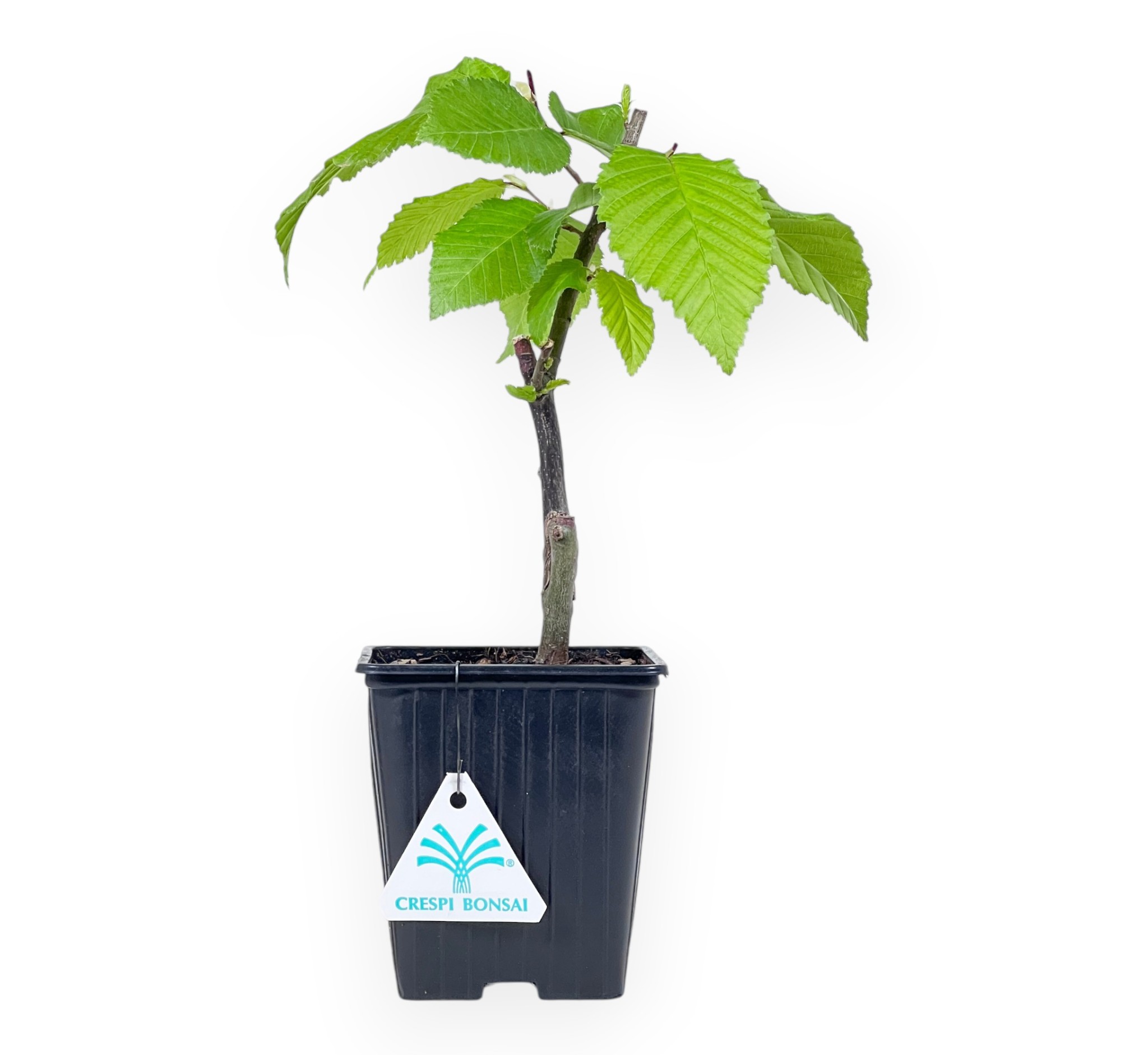 Plante à travailler de Charme caractérisé par une hauteur sans pot de 17,5 cm, et une taille de tronc de 1 cm. La plante est cultivée dans un pot carré en plastique dont les dimensions sont de 9x9xH9,5 cm.