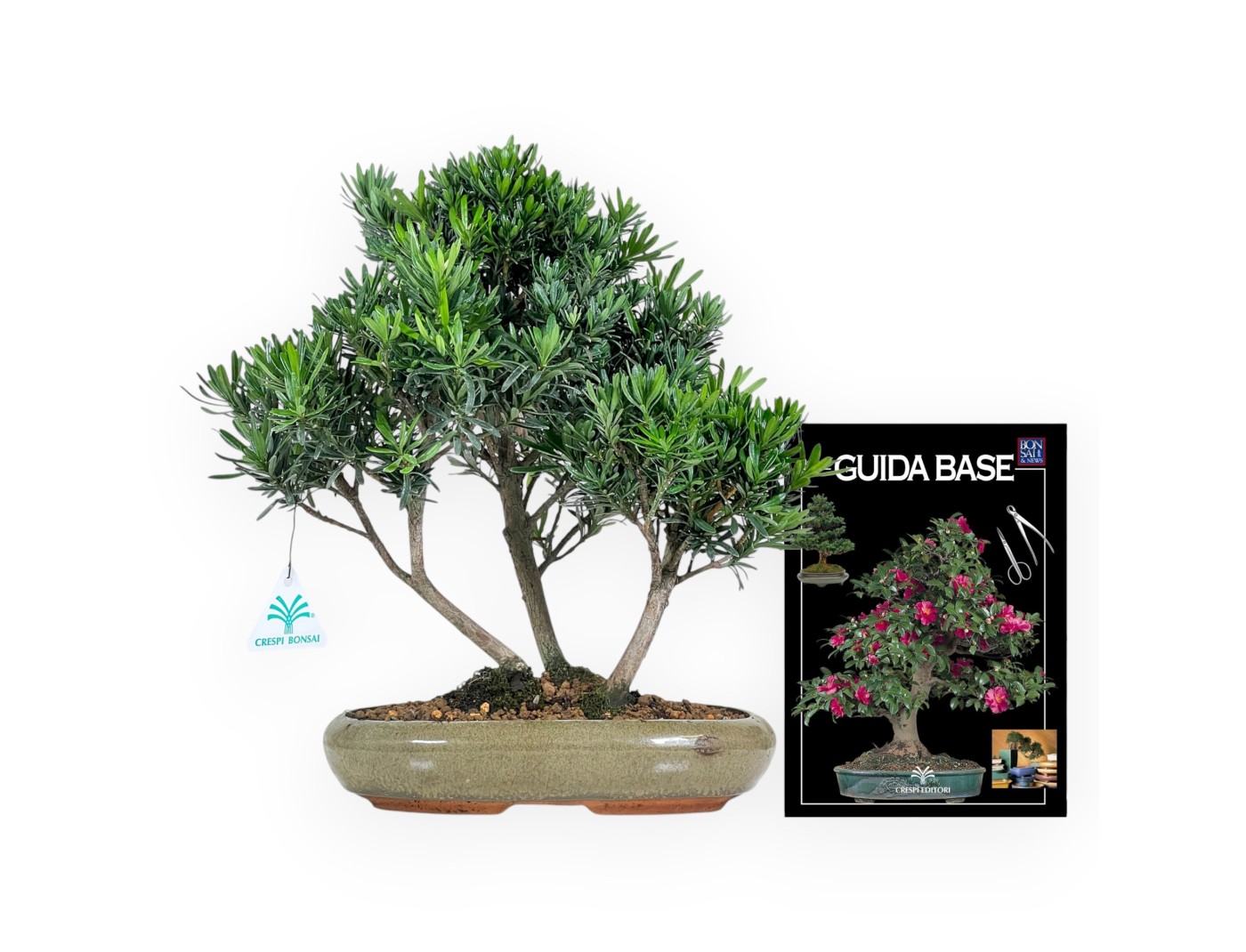 Bonsaï à feuilles persistantes, dans un pot ovale en grès émaillé vert