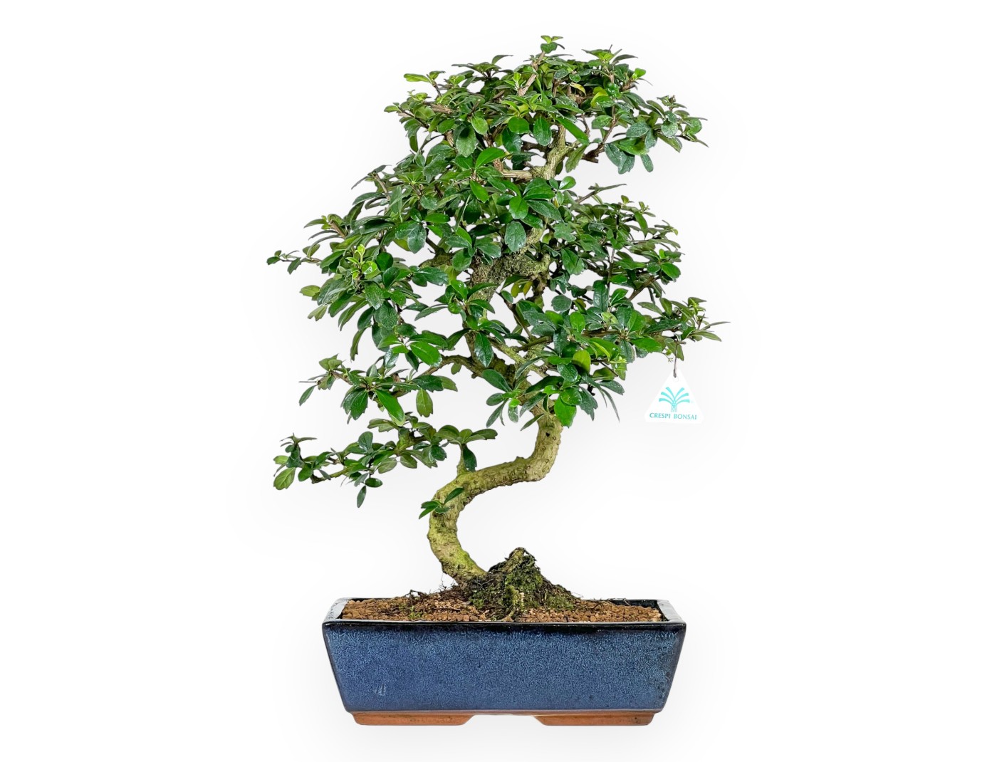 Ce bonsaï de Carmona macrophylla (arbre à thé), appartenant à la variété à feuilles persistantes d'intérieur, est apprécié pour la production au printemps et en été de petites fleurs blanches en forme d'étoile. Son feuillage, aux feuilles brillantes et compactes, est bien structuré et lui confère un aspect raffiné. Il présente une forme harmonieuse et dynamique, caractérisée par un tronc en "S", et un nebari bien développé qui ajoute de la stabilité à la base. Cultivé dans un pot rectangulaire en grès émaillé bleu, il contribue à souligner l'esthétique du bonsaï, tout en conservant un contraste délicat avec le vert intense des feuilles.
