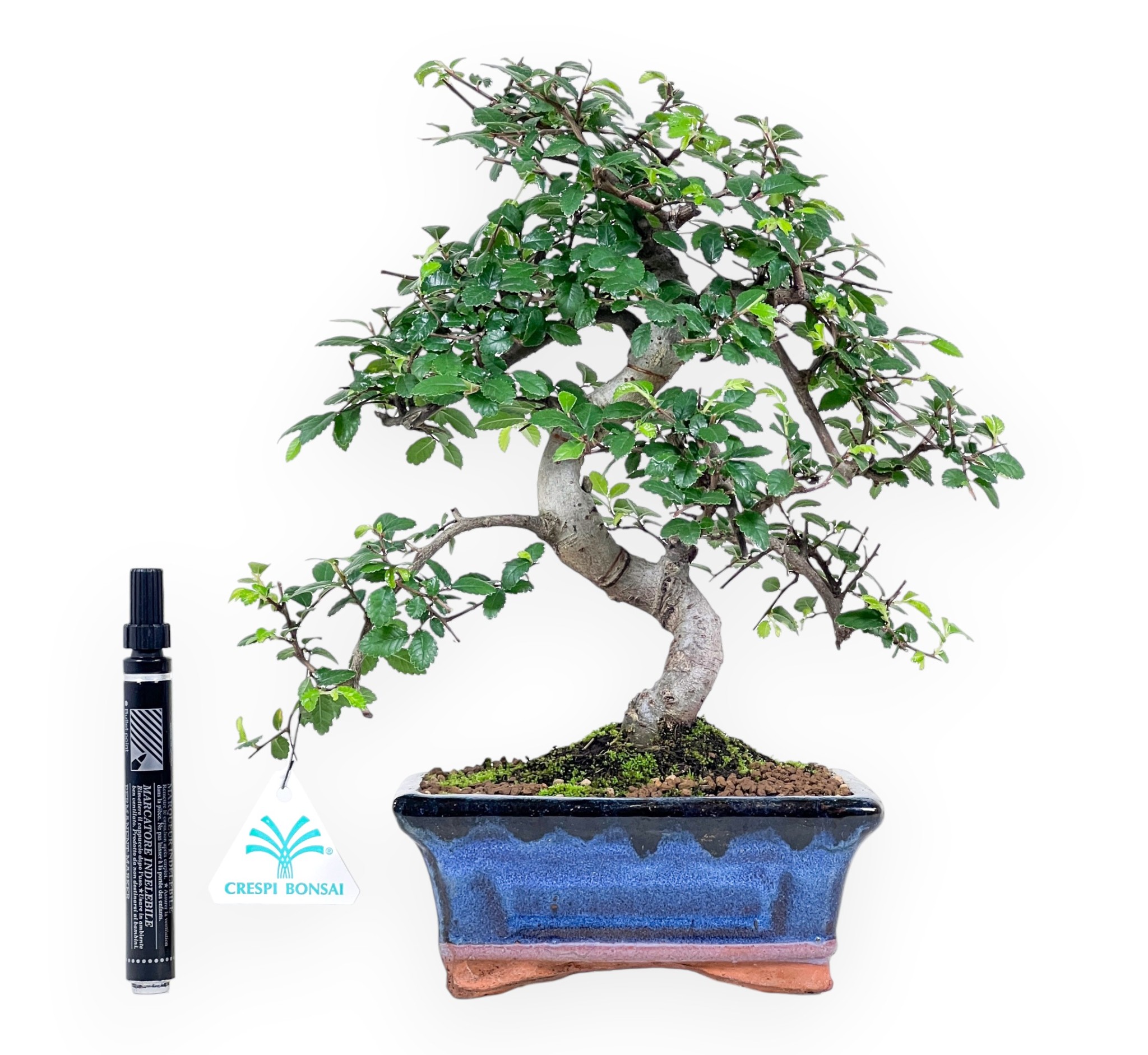 Le bonsaï Zelkova nire est apprécié pour sa rusticité, son adaptabilité et sa vigueur végétative. Il se distingue par ses petites feuilles dentelées d'un vert profond, qui forment un feuillage compact et harmonieux qui met en valeur chaque détail de la structure. Ce spécimen possède un tronc au mouvement sinueux et bien proportionné, qui soutient une ramification ordonnée développée en piquets. La structure solide et mature exprime l'équilibre et la profondeur esthétique. Il est cultivé dans un pot rectangulaire en grès émaillé bleu qui crée un élégant contraste de couleur avec le feuillage vert vif.