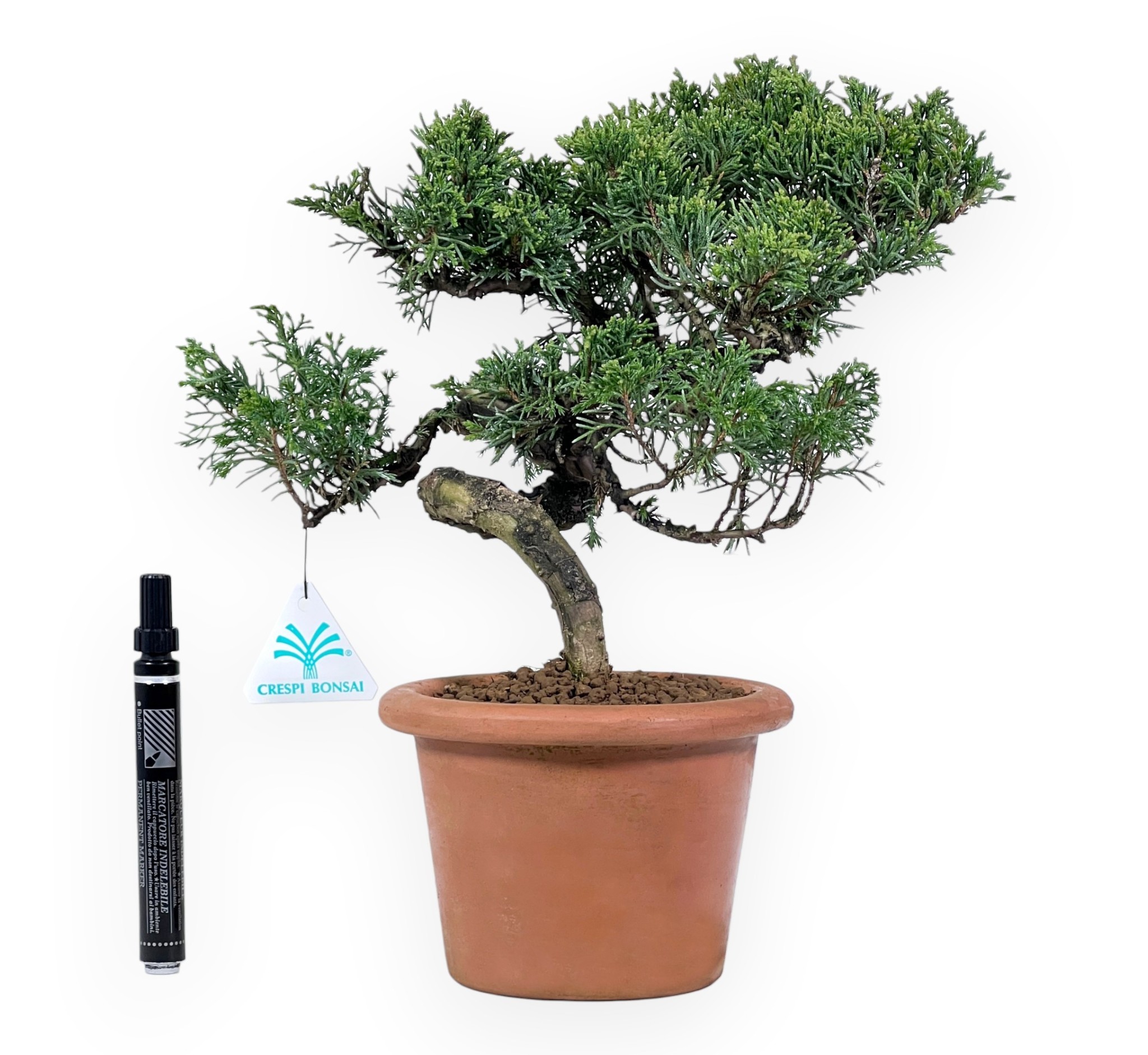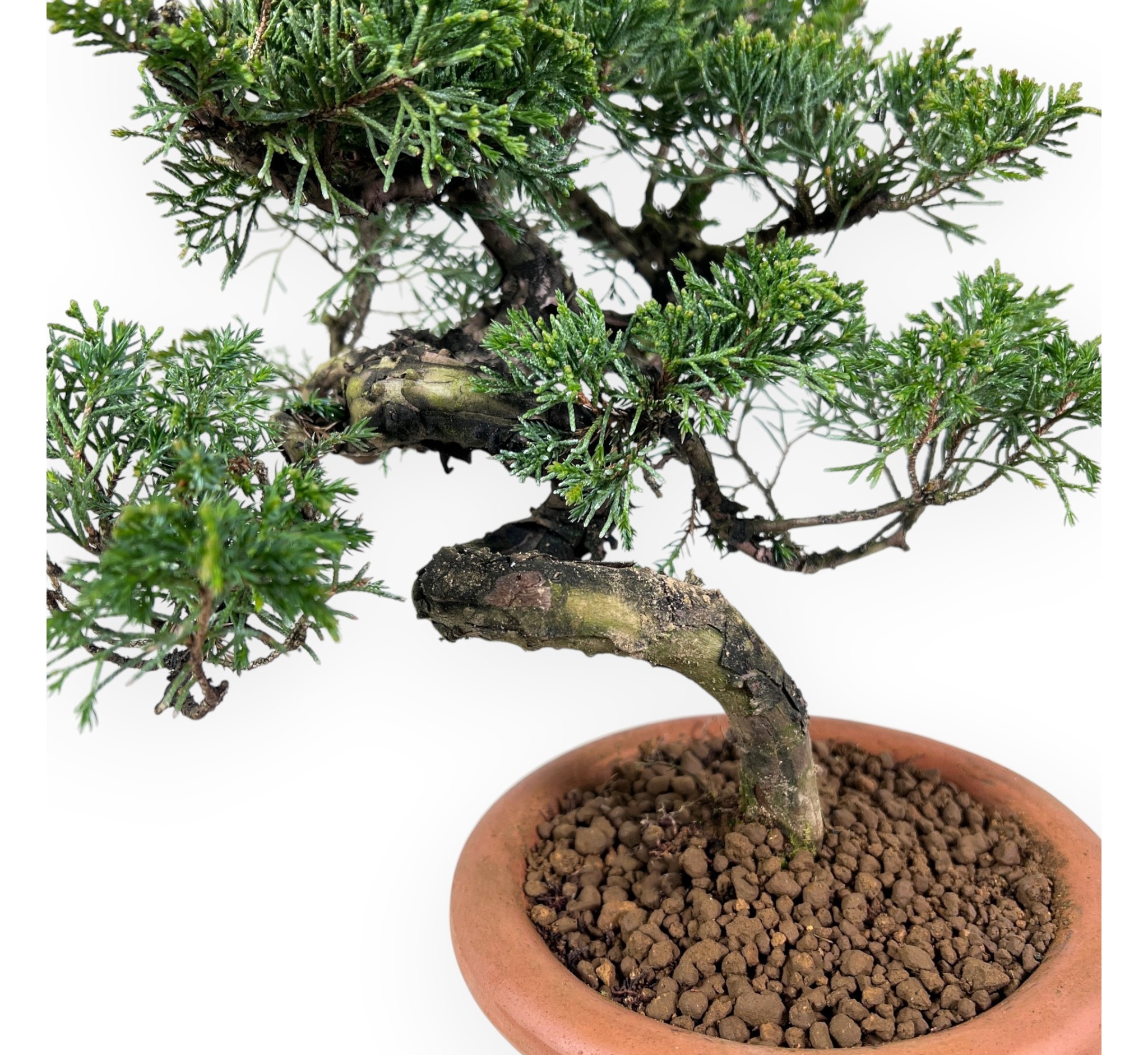 Le plante à travailler de Juniperus chinensis (genévrier), conifère à feuilles persistantes, est apprécié pour son élégance et sa résistance à différentes conditions. Le feuillage, à la ramification compacte, est d'un vert intense. Le tronc, sinueux et élégant, présente une écorce qui se fissure avec le temps confèrent à ce bonsaï un aspect distinctif. Cultivé dans un pot rond en terre cuite non émaillée, il met en valeur le mouvement du tronc et l'équilibre du feuillage, sans détourner l'attention du spécimen.
