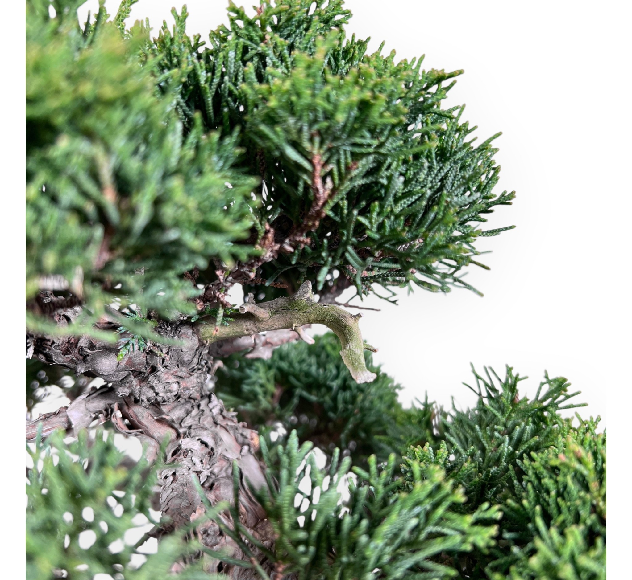 Le bonsaï de Juniperus chinensis (genévrier chinois), un conifère à feuilles persistantes, est apprécié pour son élégance et sa remarquable durabilité. Le feuillage en forme d'aiguilles, d'un vert profond, dense et compact, crée des masses bien définies qui rehaussent la structure et donnent de la profondeur à la composition. Avec le temps, l'écorce a tendance à se fissurer, prenant un aspect mature, ce qui ajoute au caractère du spécimen. Ce bonsaï est cultivé dans le style rocaille (Seki-joju), où le tronc se développe en adhérant à la pierre et les racines s'enroulent autour de la roche de manière scénographique, évoquant la force de la nature et la capacité de la plante à s'adapter à des environnements imperméables. L'ensemble traduit l'équilibre, la solidité et l'harmonie, avec une ligne dynamique qui accompagne le regard de la base au sommet du feuillage. Il est cultivé dans un pot rectangulaire en grès non émaillé, dont les tons naturels et texturés rappellent les éléments de la terre et de la roche, ce qui renforce l'authenticité de la composition et confère au bonsaï un aspect majestueux et raffiné.