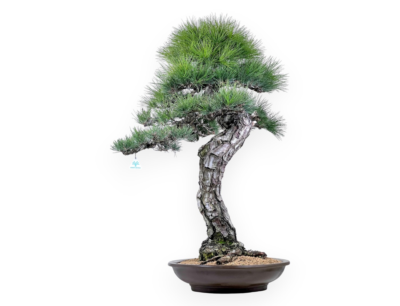 Bonsaï exemplaire unique de pin caractérisé par une hauteur sans pot de 95 cm, un tronc de 10 cm et un nebari de 32 cm. La plante est cultivée dans un pot rond en grès non émaillé dont les dimensions sont Ø44xH10 cm.