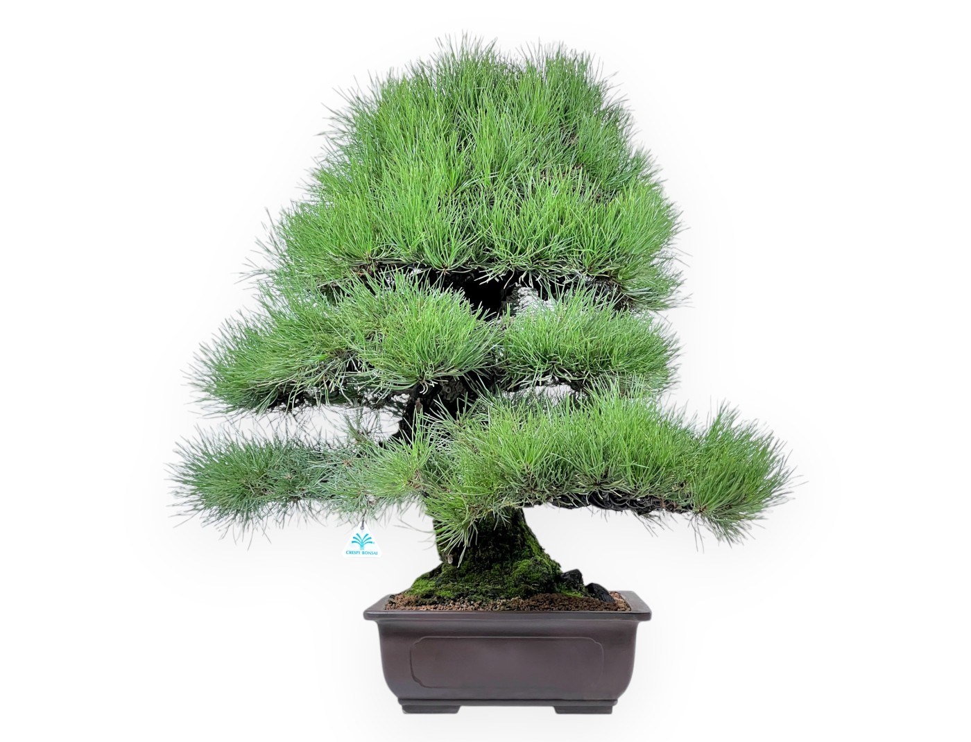 Bonsaï exemplaire unique de Pinus thunbergii (pin noir) est un conifère robuste à feuilles persistantes, très apprécié dans l'art du bonsaï pour son écorce ridée et ses aiguilles vigoureuses. Le feuillage est dense et se compose d'aiguilles doubles, longues, fines et d'un vert vif. Le tronc est solide et l'écorce ridée, mature, devient de plus en plus intéressante en vieillissant. Il présente un style dressé informel avec une structure en étages et un feuillage réparti sur plusieurs niveaux, créant un effet harmonieux et naturel. Cultivé dans un pot rectangulaire en grès non émaillé accentue le contraste des couleurs et renforce l'esthétique naturelle.