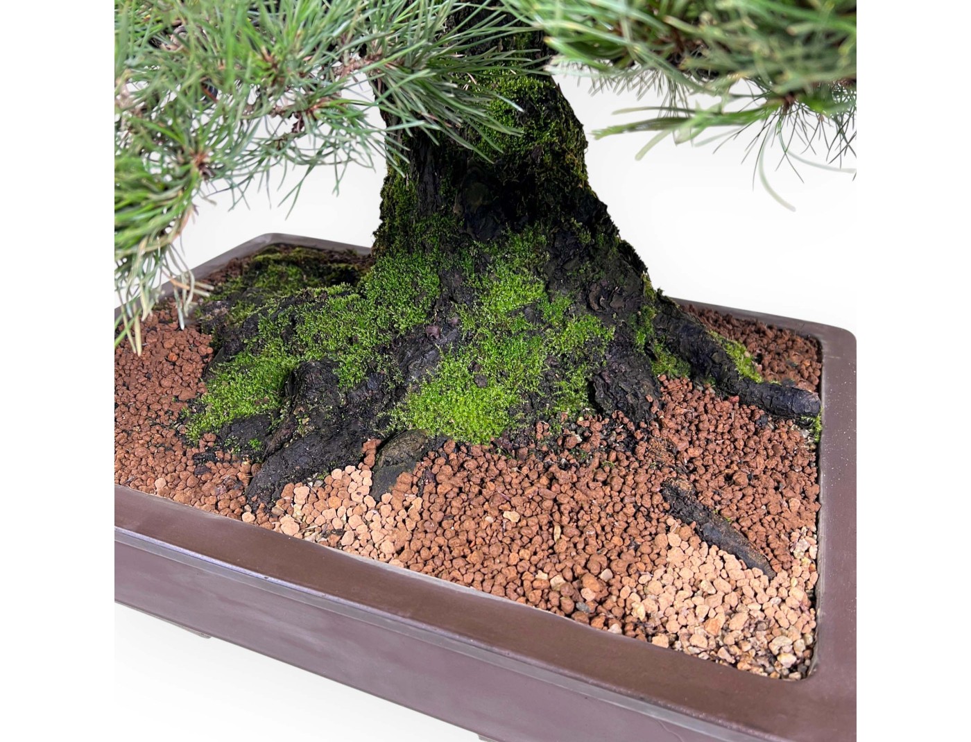 Bonsaï exemplaire unique de pin caractérisé par une hauteur sans pot de 77 cm, un tronc de 12 cm et un nebari de 34 cm. La plante est cultivée dans un pot rectangulaire en grès non émaillé dont les dimensions sont 47x34,5xh13 cm.