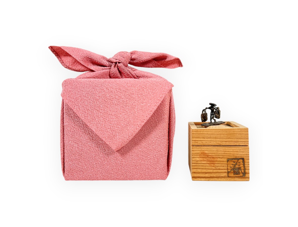 L'ensemble se compose d'un tenpai avec une personne portant du riz et un furoshiki Chirimen rose foncé uni.