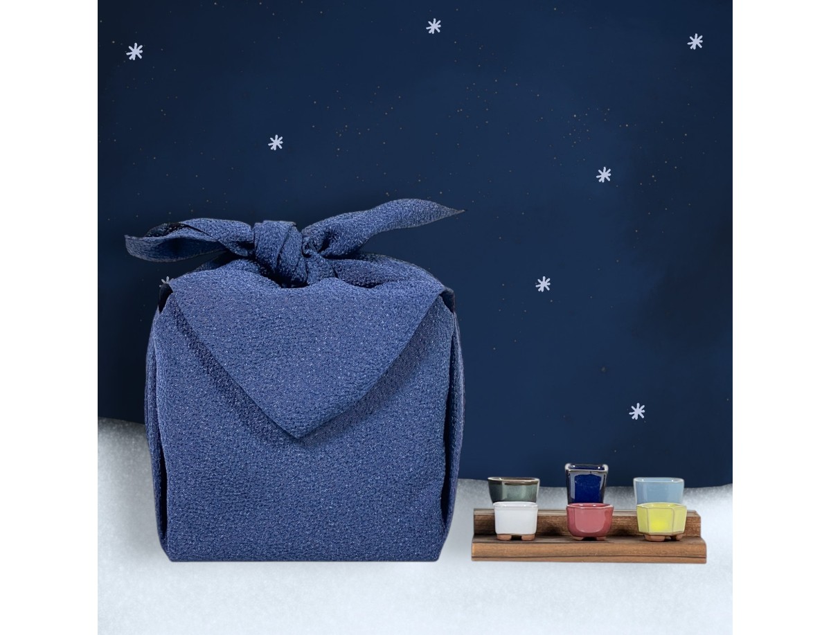 Set se compose de mini pots avec base en bois et d'un Furoshiki bleu de 45 cm