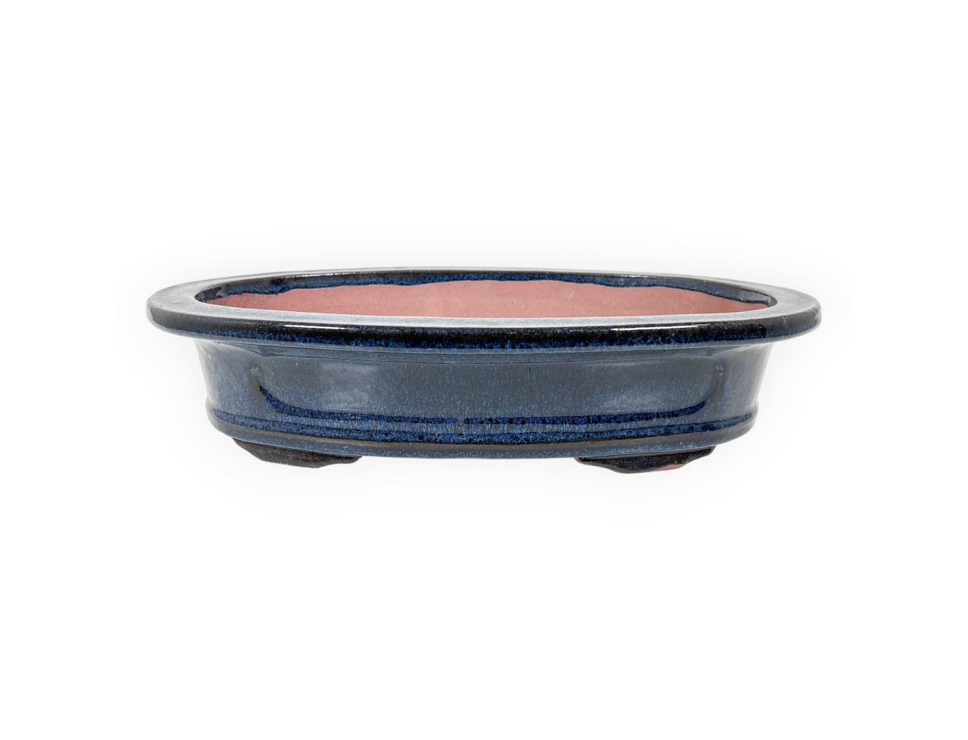 Pot à bonsaï chinois, fait à la main, ovale, en grès émaillé bleu.